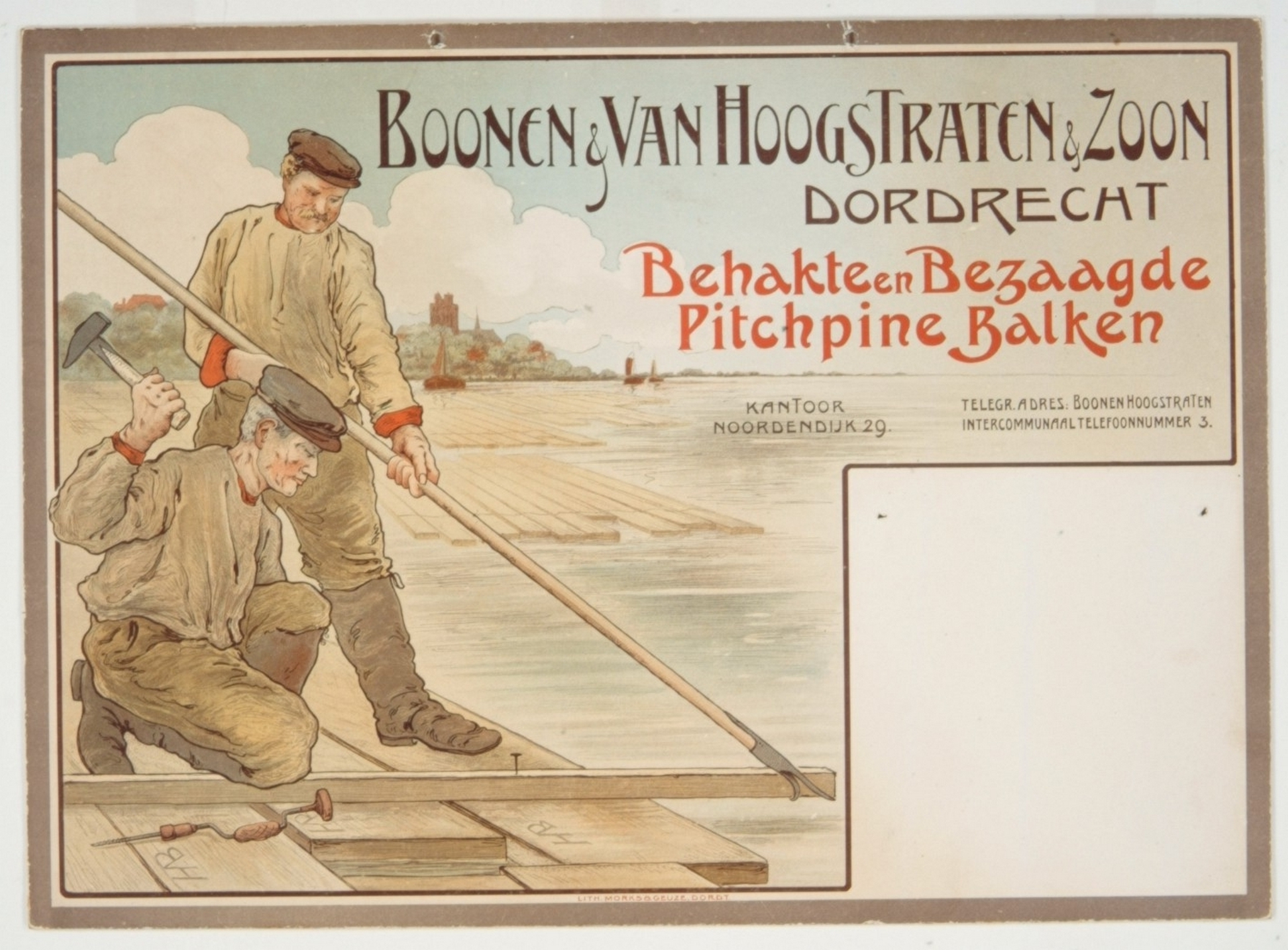 - Schild van een kalender voor 1904 van de houthandel Boonen & Van Hoogstraten & Zoon te Dordrecht, kantoor Noordendijk 29, met houtvlotters op het Wantij.