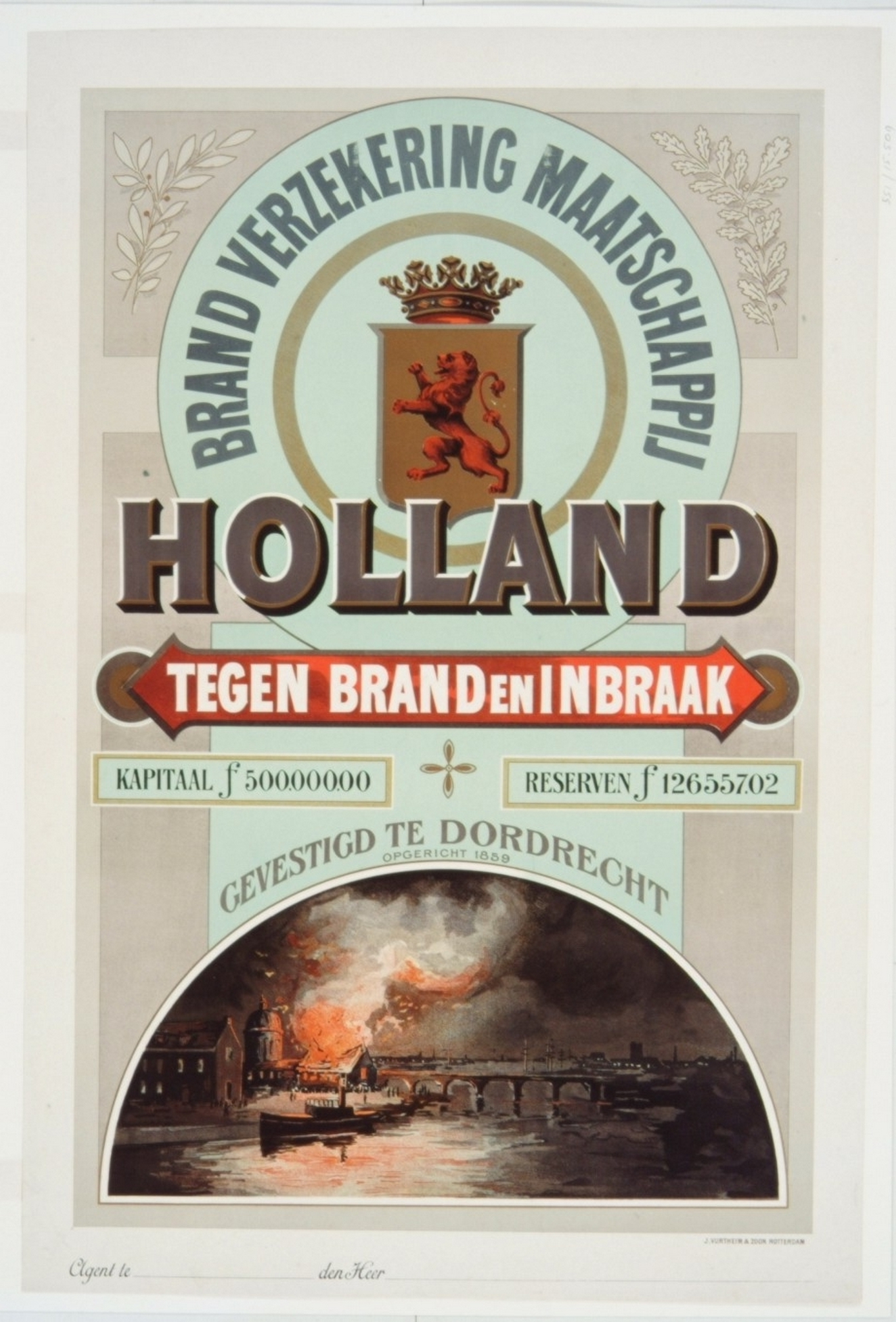 Reclameplaat van de brandverzekeringmaatschappij Holland, opgericht 1859, met het wapen van de maatschappij en de afbeelding van een brand.