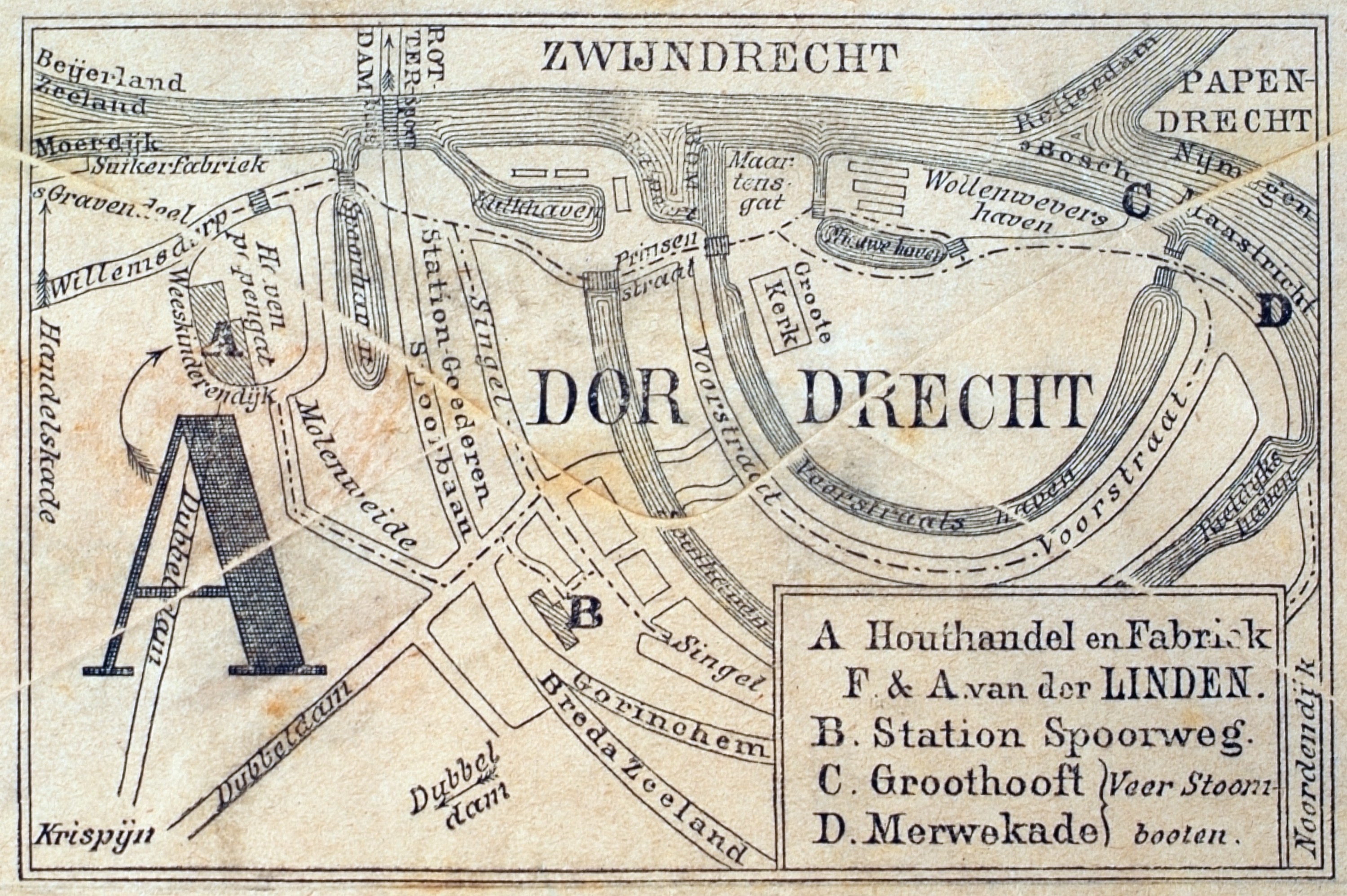 Envelop van houthandel F. & A. van der Linden met plattegrond van Dordrecht