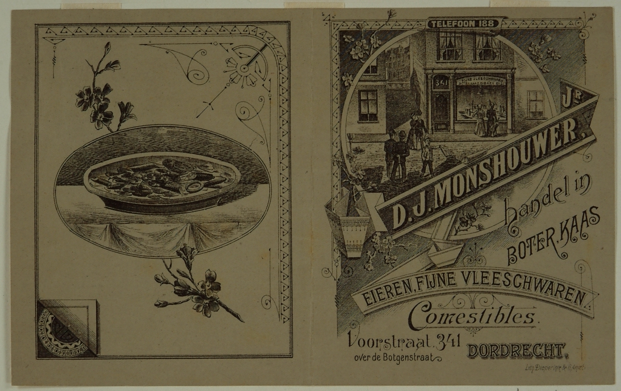 Reclamebiljet van de specialiteitenwinkel van D.J. Monshouwer
