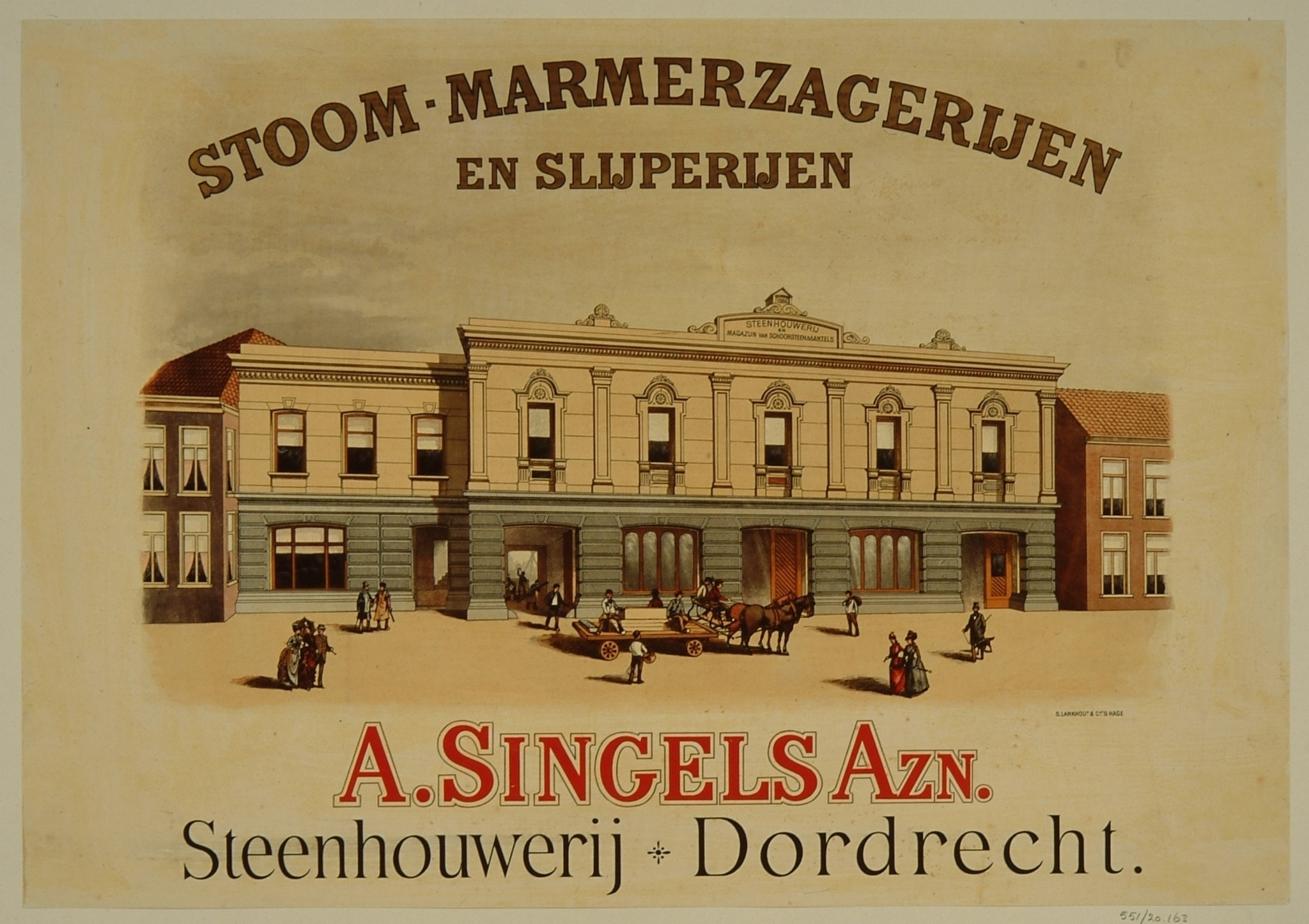 Reclameplaat van de stoommarmerzagerij en steenhouwerij van A. Singels Azn. met …