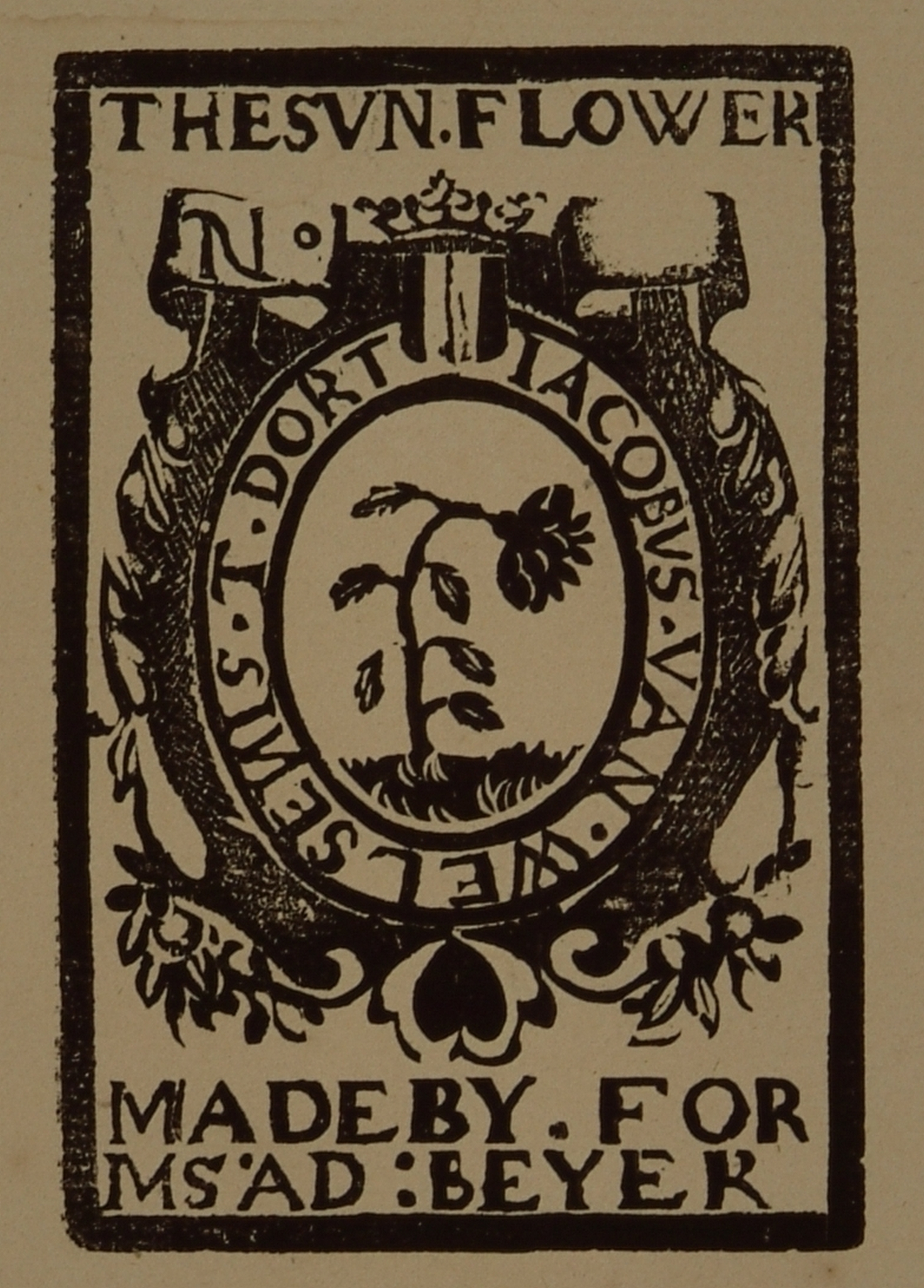 Etiket van vermoedelijk chocolade van Jacobus van Welsenis, met afbeelding van een zonnebloem (The sun flower)