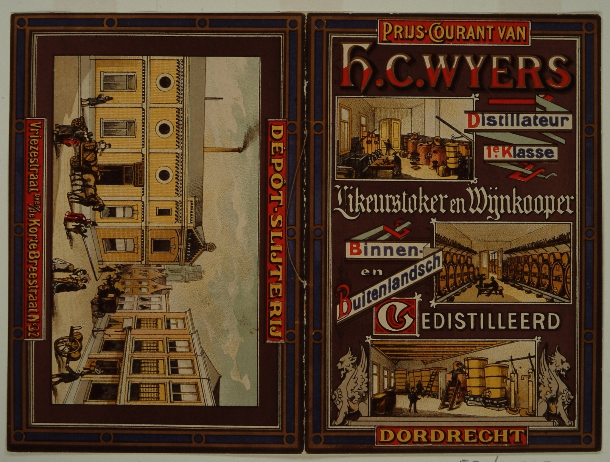 - Reclame-biljet voor likeurstoker en wijnkoper H.C. Wijers, met in- en exterieur van het gebouw op de hoek Lange Breestraat en de Vriesestraat