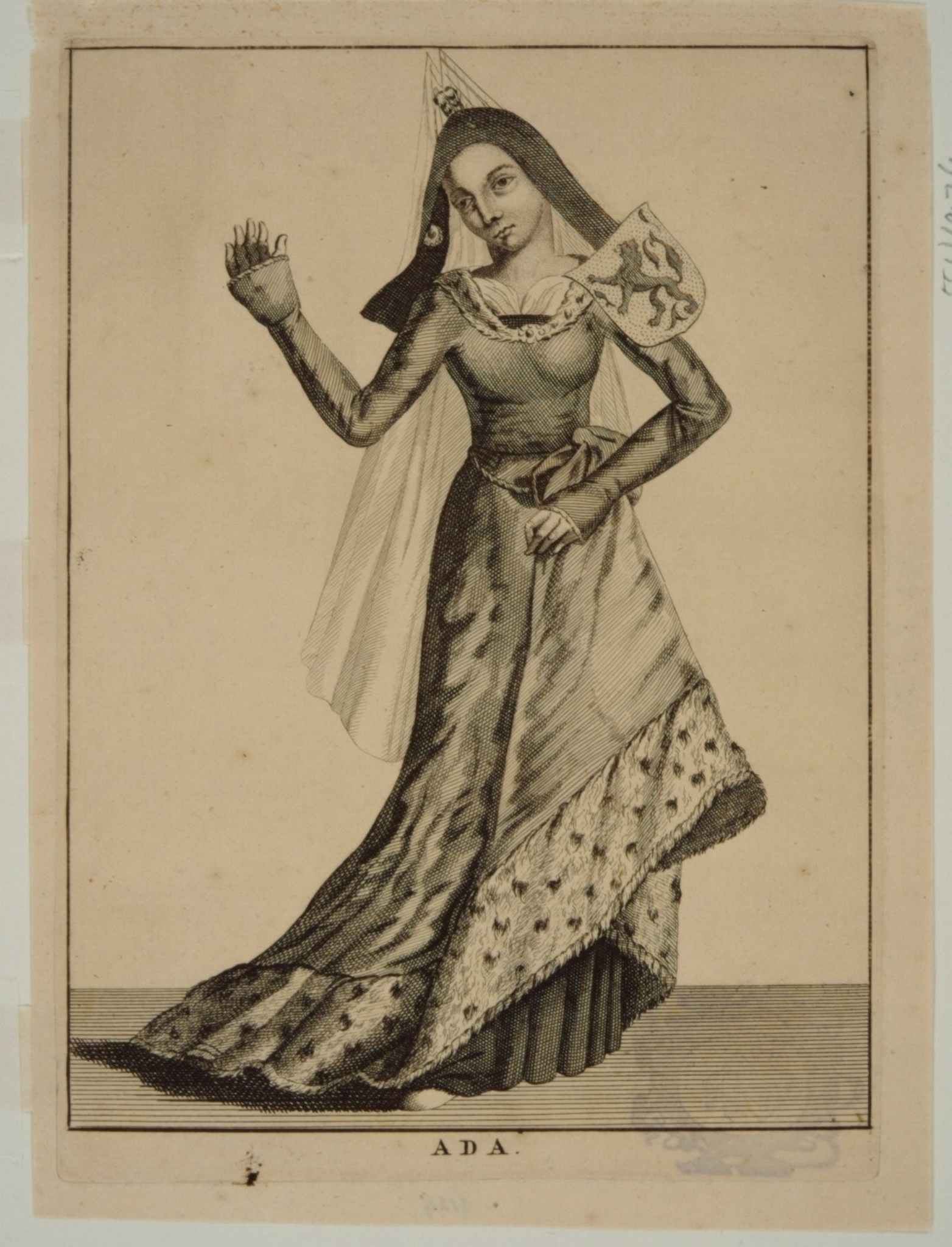 - hxb: 23,3 x 16,3 cm. Waarschijnlijk uit: Ludolf Smits, Levensschetsen en afbeeldingen der Graaven van Holland, 1744, Haarlem. Ada, gravin van Holland werd geboren in 1183, regeerde slechts één jaar 1203/1204 en stierf in 1218. Was getrouwd met Graaf Lodewijk II van Loon