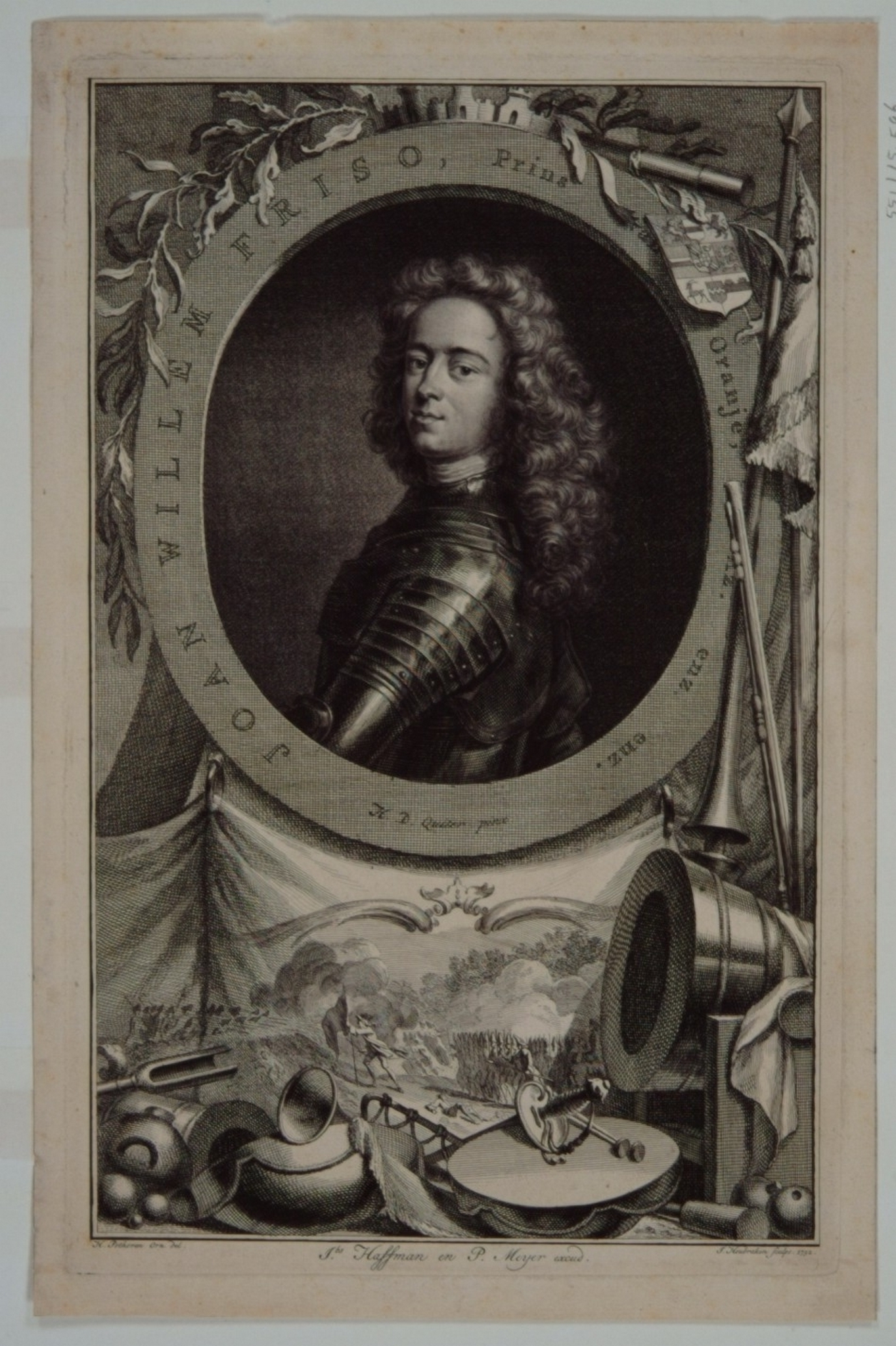 - Gravure door J. Houraken naar H. Pothoven; uit: Verzameling van 21 uitmuntende portraiten der Ned. Stadhouders en hunne vorstelijk familiën, door P. Tanjé en J. Houbraken; afmetingen: Hg. 35, br. 21.5 c. (Muller 458, Van Someren 1 nr. 125). Nota Bene: Betreft prins Johan Willem Friso, geboren te Dessau 1684, verdronken in het Hollandsch Diep nabij Strijensas in 1711; stadhouder van Friesland en Groningen.