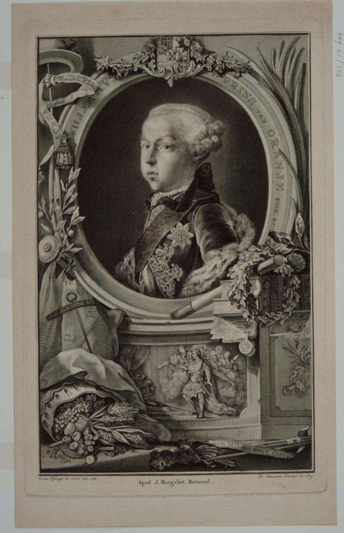 Gravure door Beauvarlet naar G. van Nymegen; afmetingen: Hg. 37.5, br. 23.5 c. (Muller 347). Nota Bene: Betreft prins Willem V, geboren te Den Haag in 1748, overeden. te Brunswijk in 1806.; erf-stadhouder en Kapitein-Generaal der Verenigde Nederlanden; bracht op 21 mei 1766 een bezoek aan Dordrecht.
