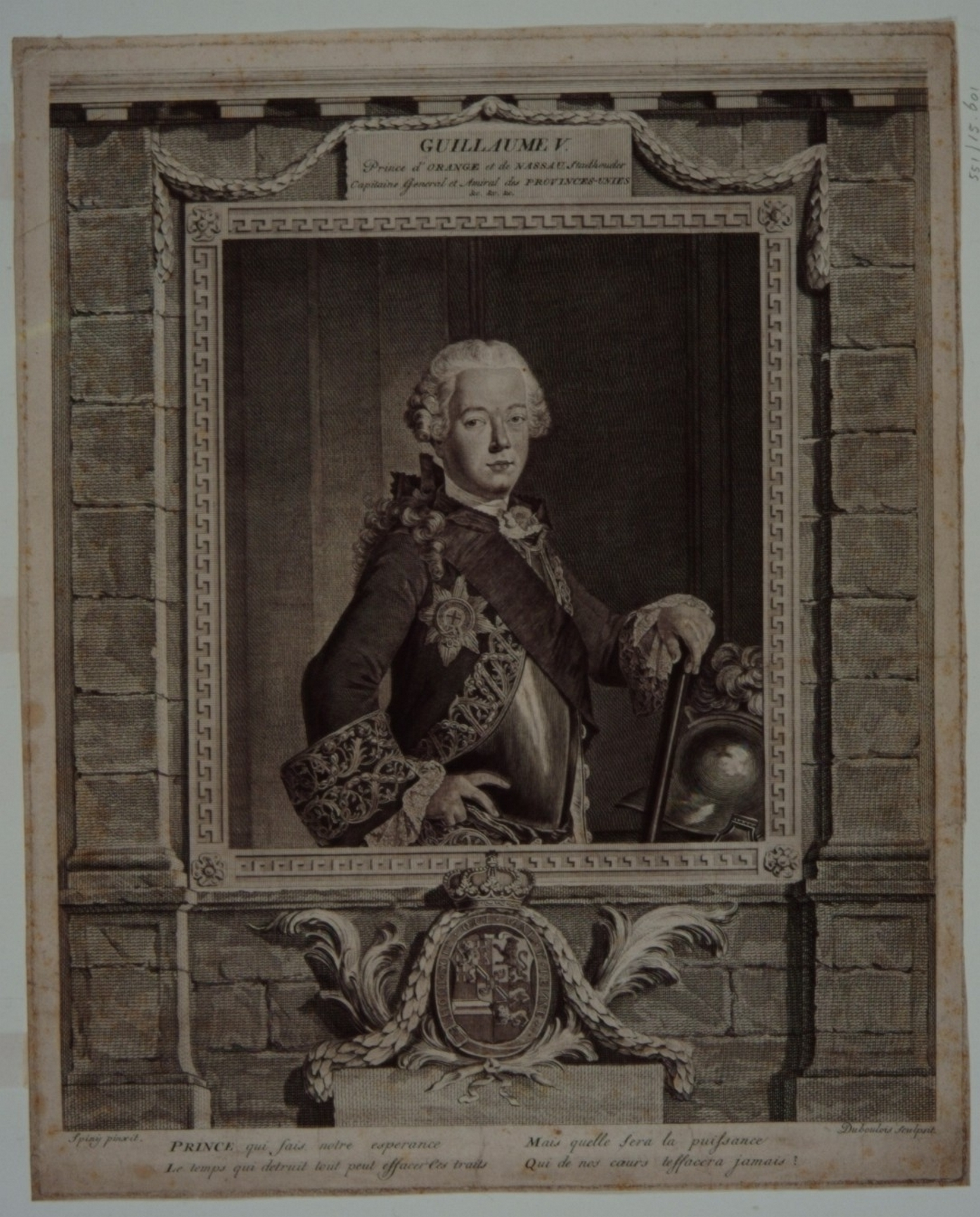 - Willem V, prins van Oranje-Nassau, ter halver lijve naar rechts kijkende op 17-jarige leeftijd, in een vierkant lijstwerk van gehouwen steen, met vierregeling Frans vers.