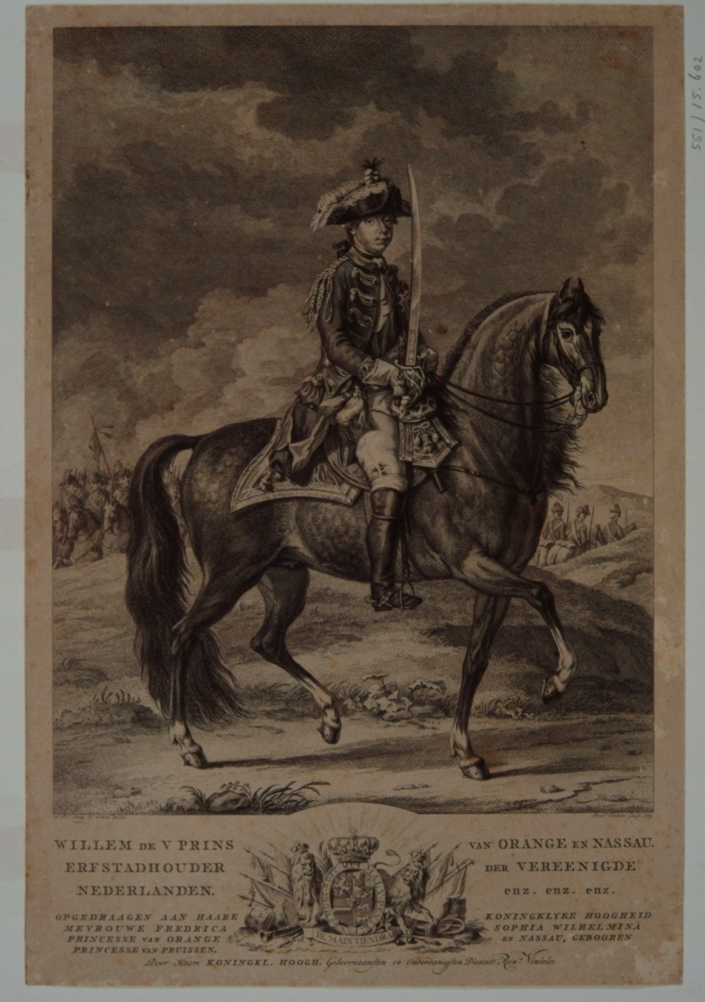 Portret van Willem V, prins van Oranje-Nassau op 31-jarigen leeftijd, te paard gezeten, …