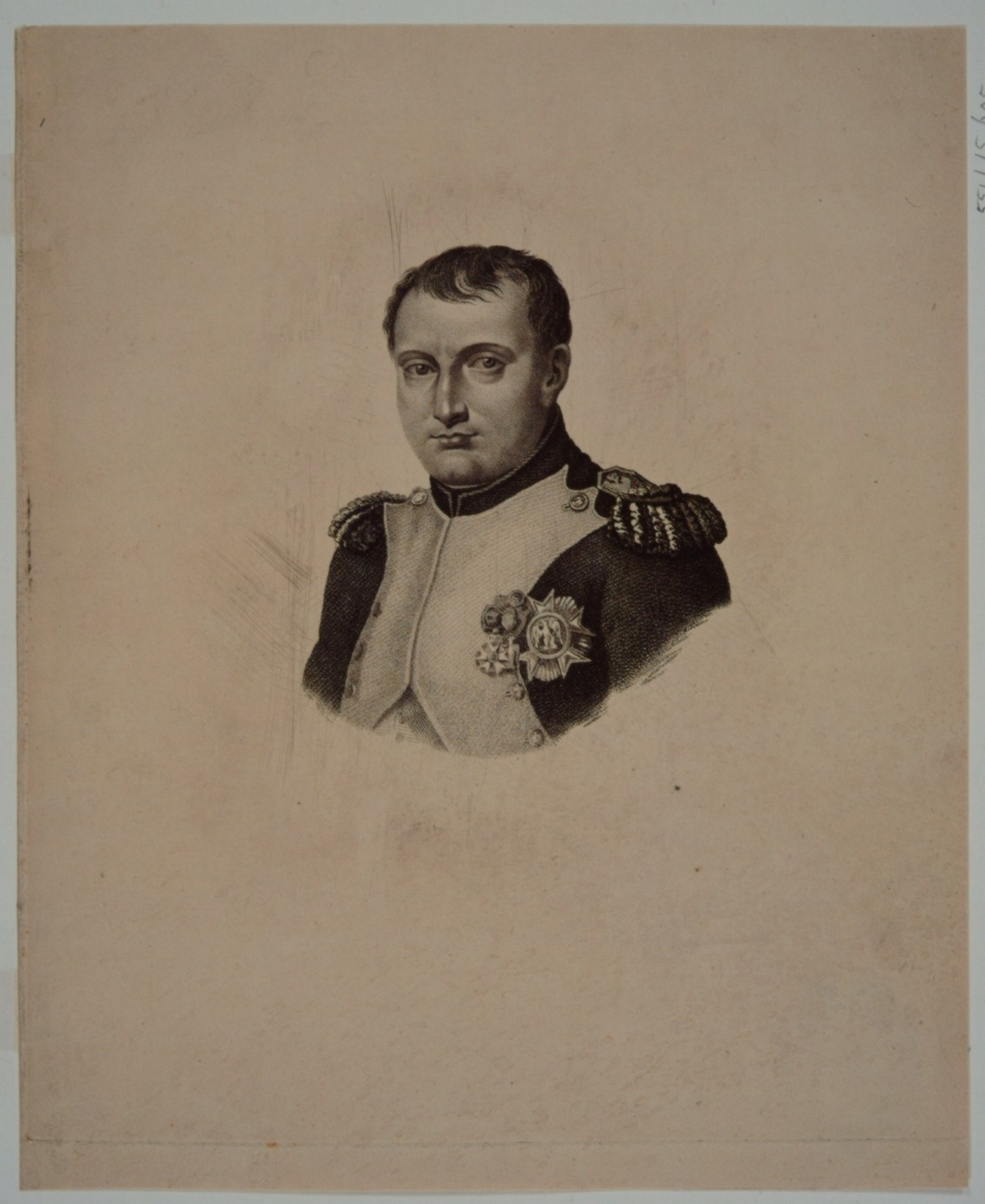 Afmetingen: Hg. 13.5, br. 10.5 c. (niet bij Muller of Van Someren). Nota Bene: Betreft Napoleon Bonaparte, geboren op Corsica in 1769 en overleed op het eiland St. Helena in 1821; keizer van Frankrijk van 1804-1813 en 1815; hij bezocht Dordrecht op 5 oktober 1811