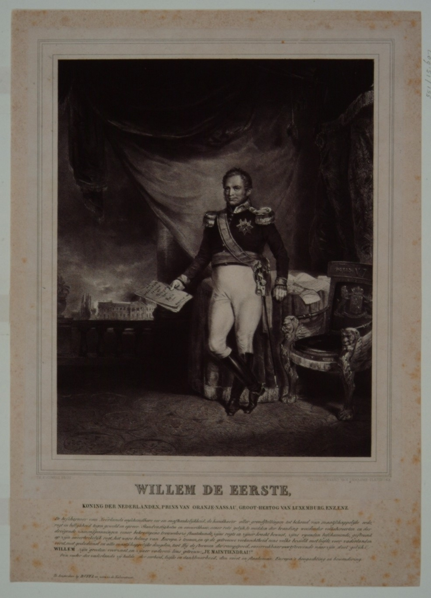 - Willem Frederik, prins van Oranje-Nassau, koning van Nederland, ten voeten uit, staande links voor een tafel, met een papier in de hand en in de achtergrond het Koninklijk paleis te Brussel