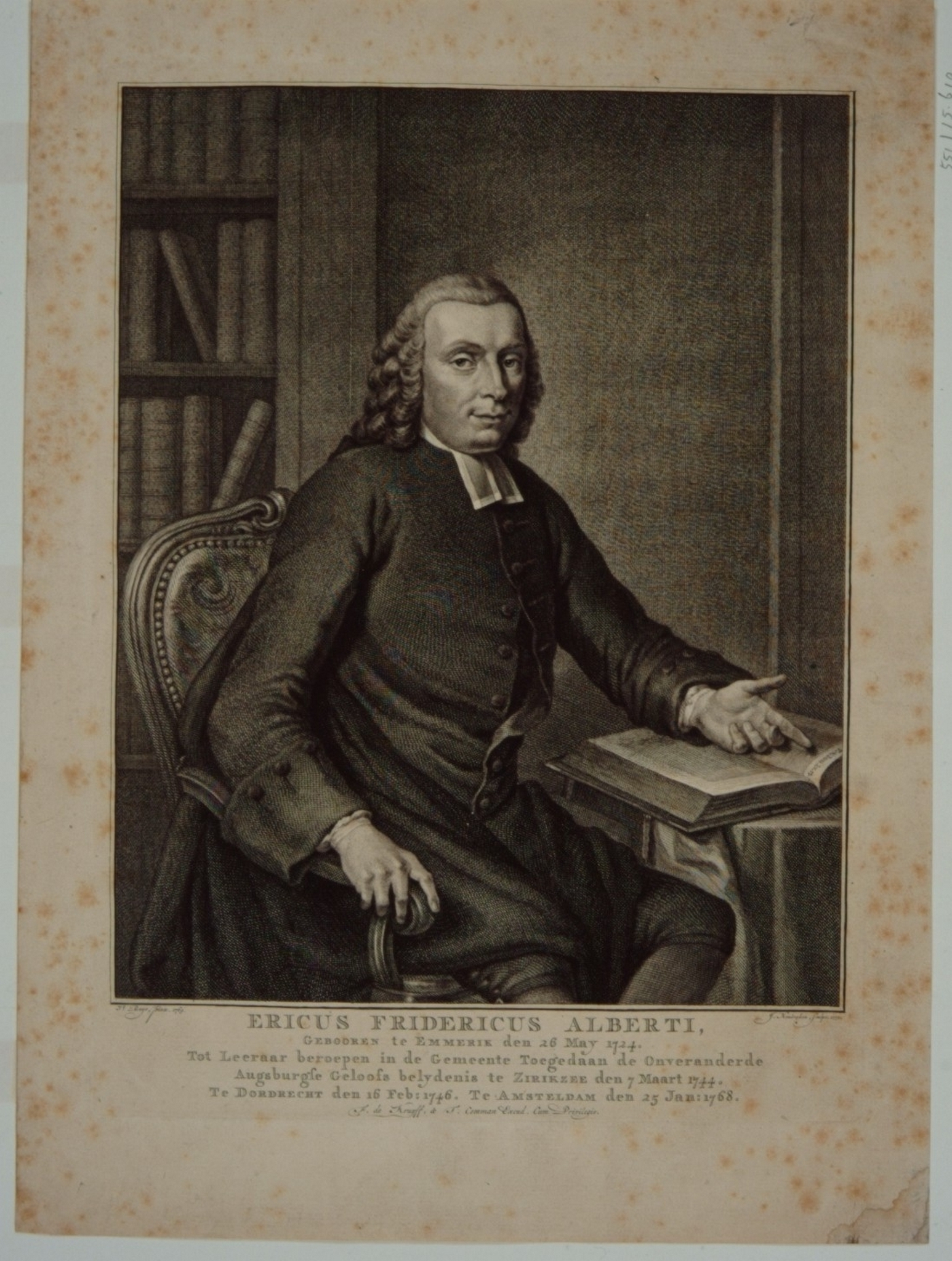 - Gravure naar J. Buys; afmetingen: Hg. 34.5, br 25.5 c. (Muller 58). Nota Bene: Betreft Ericus Fridericus Alberti, geboren te Emmerik in 1724, overleden te te Amsterdam, Luthers predikant te Dordrecht 1746-1768, daarna te Amsterdam.