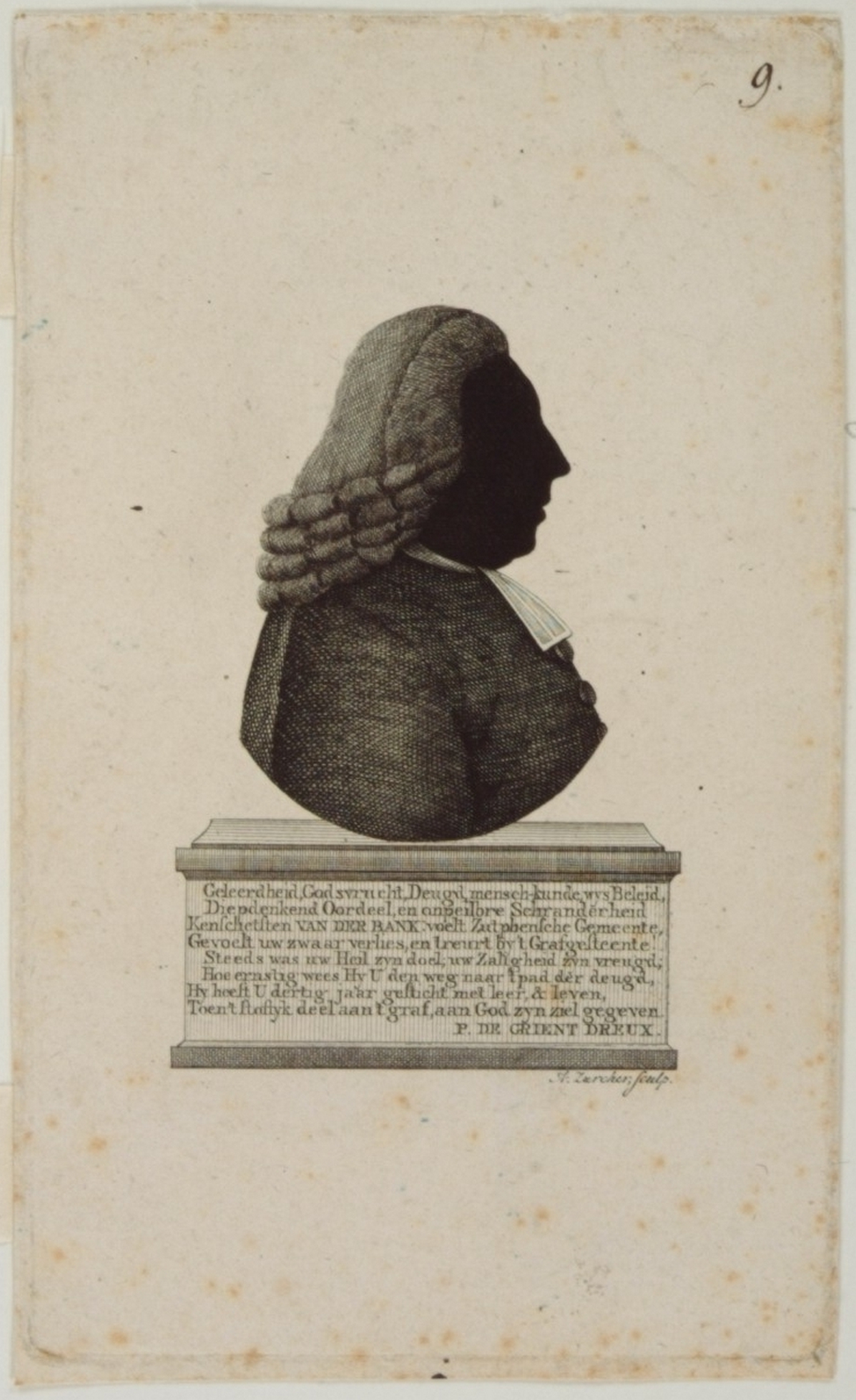 - Portret in silhouette van Henricus van der Bank met 8-regelig vers van P. de Grient Dreux