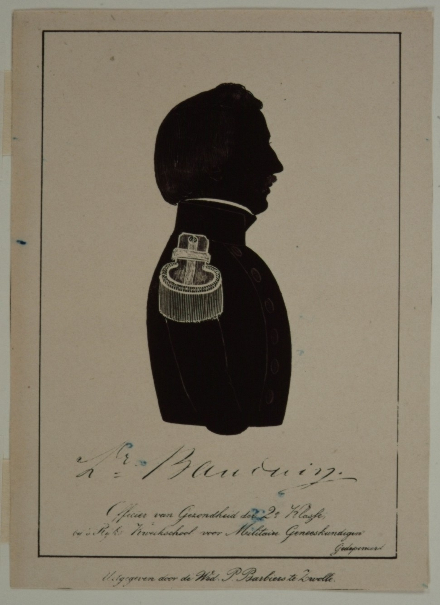 - hxb: 13,6 x 9 cm. Vermoedelijk uit een jaarboek voor militaire geneeskundige studenten. Dr. Anthonie Franciscus Bauduin werd geboren te Dordrecht 1820 en overleed in Den Haag 1885. Hij was officier van gezondheid tweede klasse bij de Rijkskweekschool voor Militaire Geneeskunde en is tevens in dienst van de Japanse regering geweest