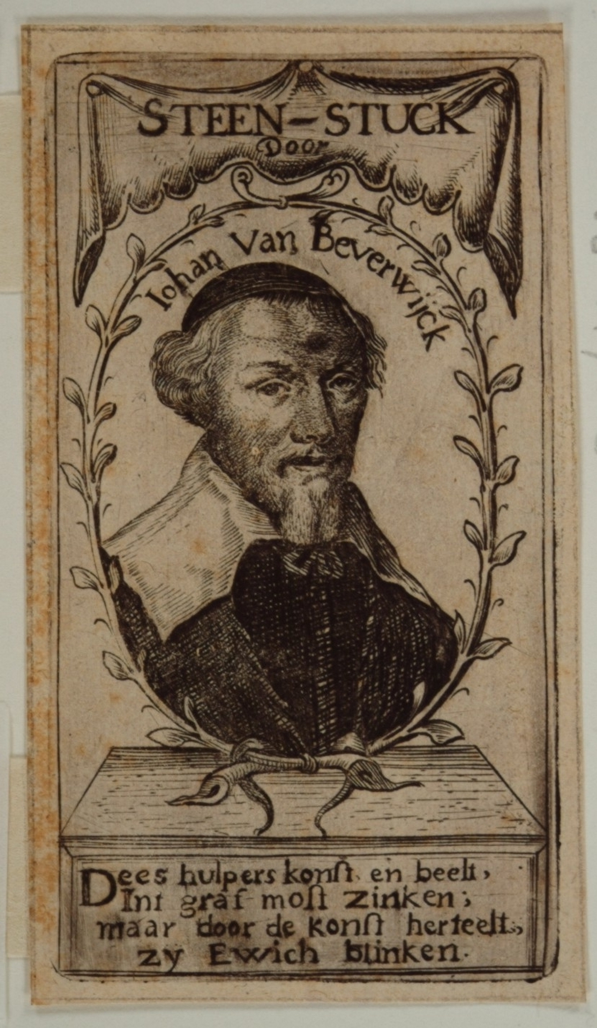 - hxb: 10,5 x 6 cm. Titelprent van Johan van Beverwijck Steenstuk enz, Amsterdam, 1651 (v.S. 427**).