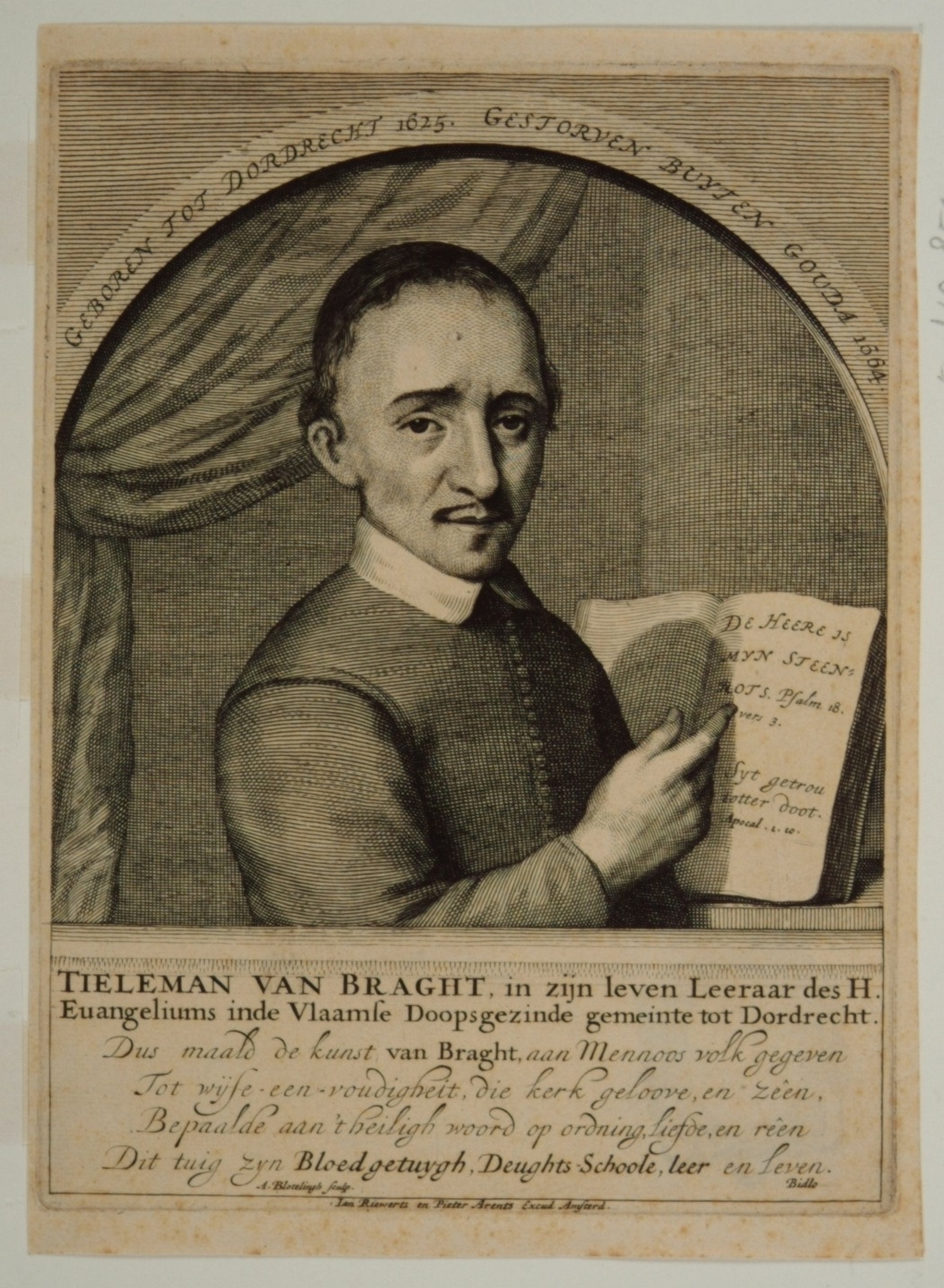 hxb: 20,2 x 15 cm. Tieleman van Bracht (of Braght) leefde van 1625 tot 1664 te Dordrecht. Leraar bij de Vlaams Doopsgezinde gemeente van 1648 tot zijn dood. Schrijver van theologische werken, waaronder een martelaarsboek van doopsgezinden