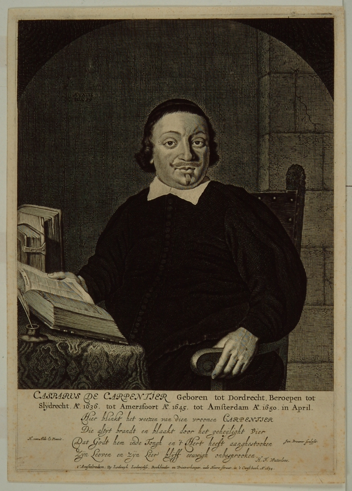 - hxb: 31 x 21,5 cm. Naar schilderij van H. van Aldewerelt, met 4-regelig vers van H.F. Waterloos (M. 955). Casparus de Carpentier werd geboren in Dordrecht 1607 en overleed te Amsterdam 1667. Hervormd predikant te Sliedrecht en Amersfoort en van 1650 tot 1667 in Amsterdam.