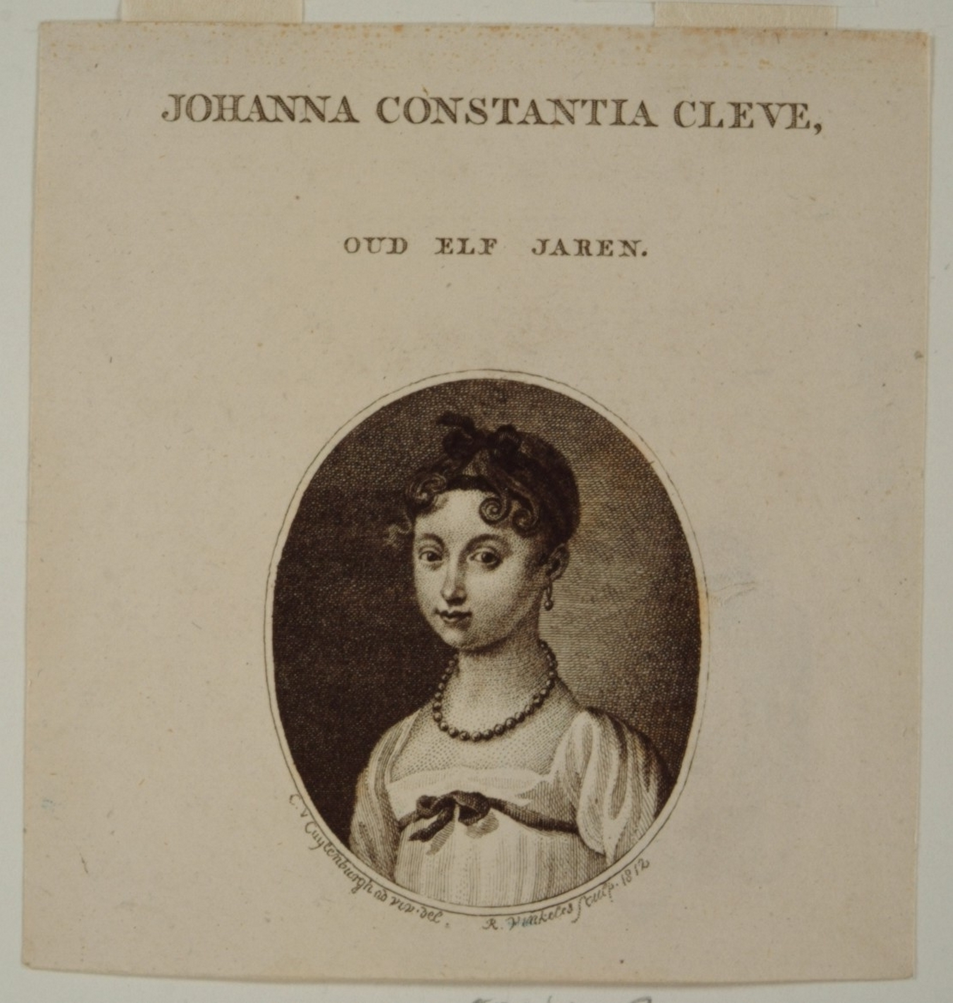 - hxb: 9,5 x 8 cm. Naar de tekening van C. van Cuylenburgh. Titelprent bij haar werk Jeugdige Dichtproeven Johanna Constantia Cleve werd 1800 geboren te Dordrecht en overleed te Den Haag 1822. Dichteres.