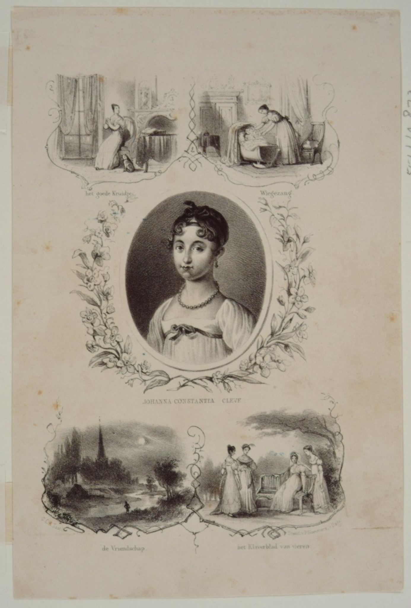 - Portret van Johanna Constantia Cleve omgeven door taferelen uit haar gedichten