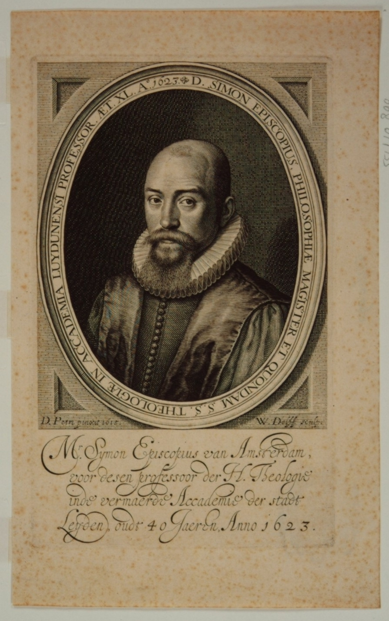 - hxb: 22,5 x 14 cm. Naar schilderij van D. Petri, 1615 (M. 1475). Geboren te Amsterdam 1583 en aldaar overleden 1643. Hoogleraar theologie in Leiden. Een van de hoofden van de Remonstrantse partij en zodanig gedaagde op de Dordtse Synode van 1618. Hij werd in 1619 verbannen en keerde in 1626 terug. In 1634 werd hij hoogleraar aan de Kweekschool der Remonstranten in Amsterdam.