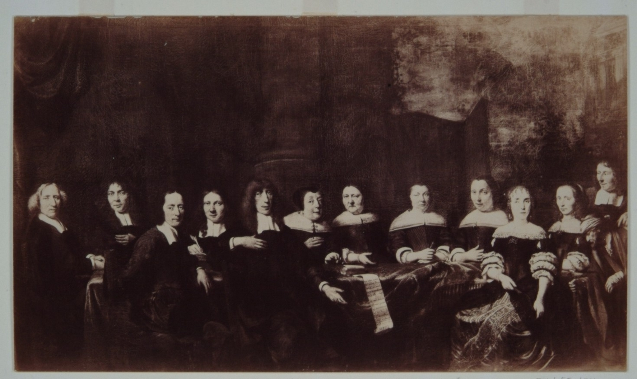 - Heilig Sacramentsgasthuis: regenten en regentessen; op de van de tafel afhangende strook papier de namen van de geportretteerden; vijfde van links de voorzitter Cornelis de Witt