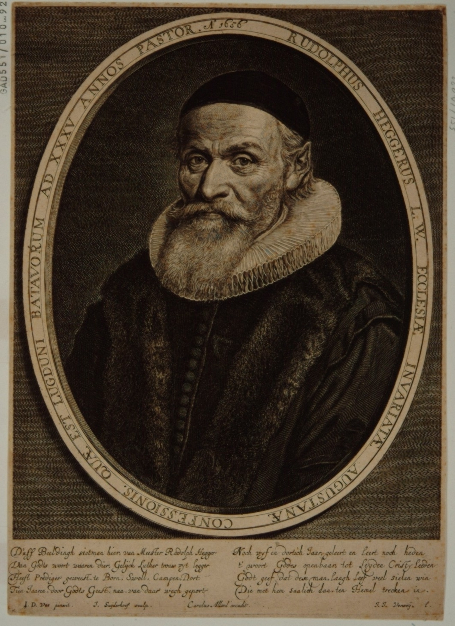 - hxb: 32 x 23 cm. Naar schilderij van J.D. Vos (M. 2238). Afkomstig uit Lingen en overleden te Leiden 1665. In 1623 was hij leraar van de Lutherse gemeente te Dordrecht, daarna tot 1665 Luthers predikant in Leiden.
