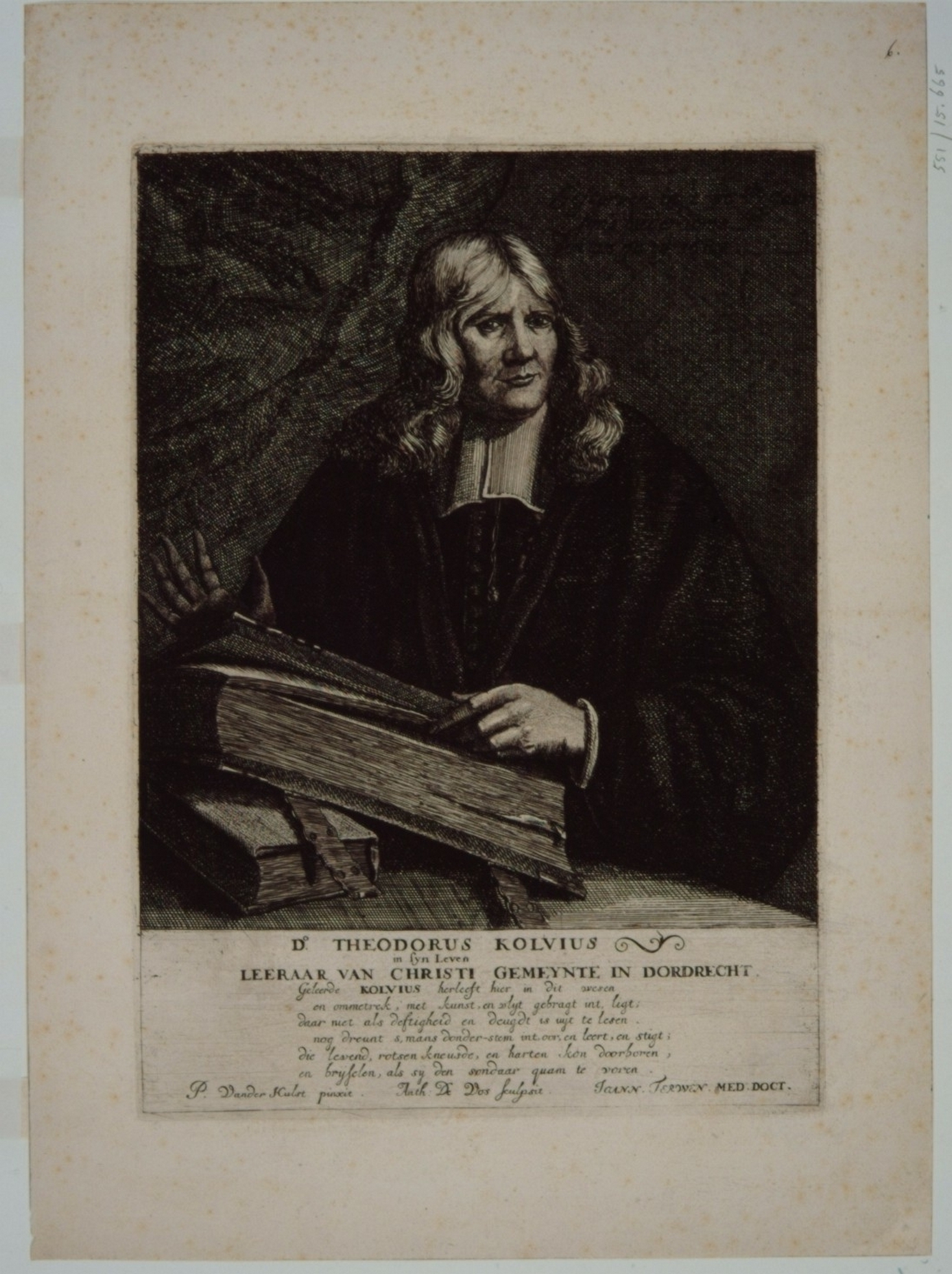 - Gravure naar P. van der Hulst; afmetingen: Hg. 32.2, br, 23.4 c. (Muller 2975). Nota Bene: Betreft Theodorus Kolvius, geboren te Zwijndrecht 1631 (?), overleden te Dordrecht 1687; Hervormd predikant te Dordrecht 1680-1687.
