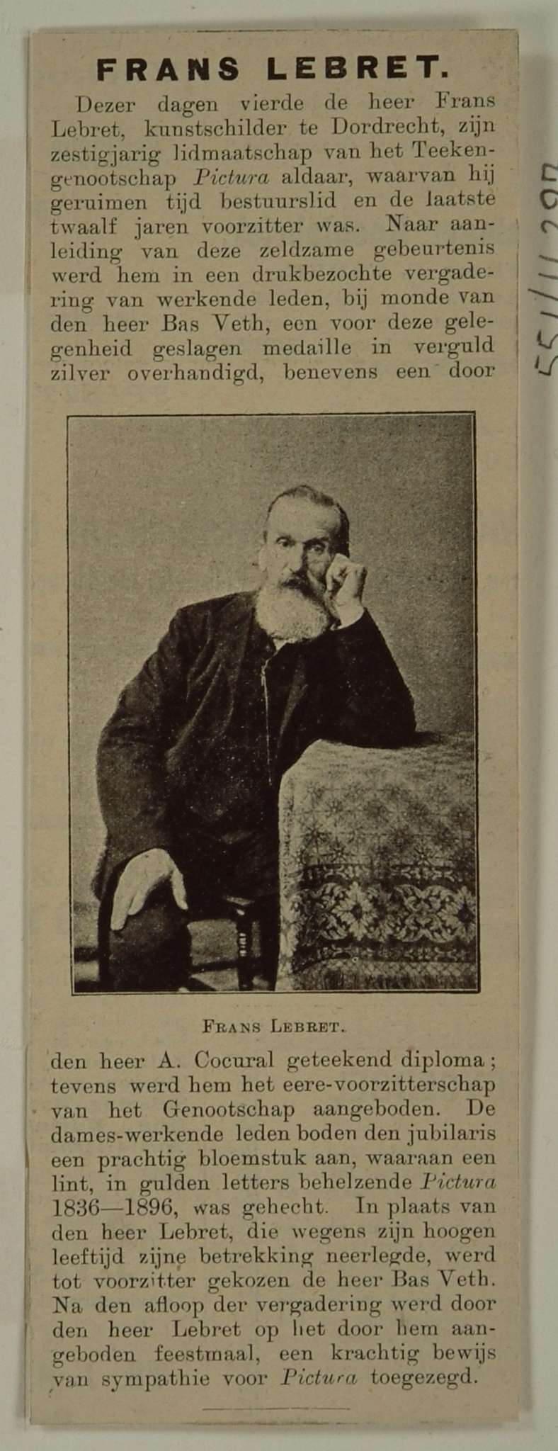 - hxb: 8 x 5,7 cm. Uit: De Wereldkroniek, no. 28, 10 oktober 1896, naar aanleiding van zijn 60-jarige lidmaatschap van Teekengenootschap Pictura