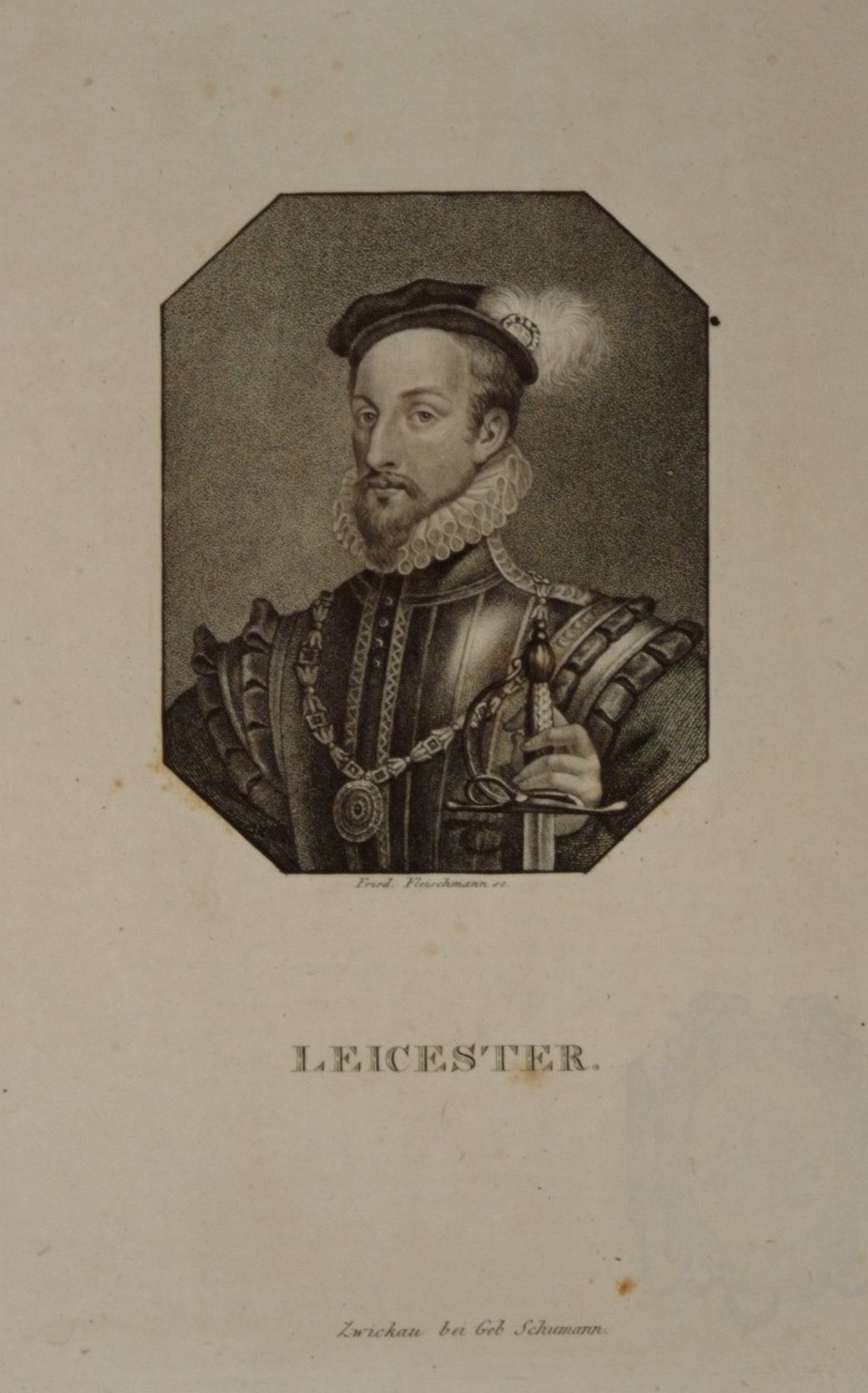 - hxb: 9,2 x 7,3 cm. Geboren 1531 en overleden in Cornbury Park, Oxfordshire 1588. Goeverneur- en Kapitein-Generaal van de Verenigde Nederlanden 1585-1588. Wordt bij zijn aankomst in Dordrecht op 19 december 1565 ingehaald. 15 juli 1586 hecht hij zijn goedkeuring aan en beveelt de aanleg van - door de Dordrechtse regering ontworpen - verdedigingswerken, die echter nooit werden gerealiseerd. 25 augustus 1586 roept hij de Algemene Staten op tot vergadering in Dordrecht.