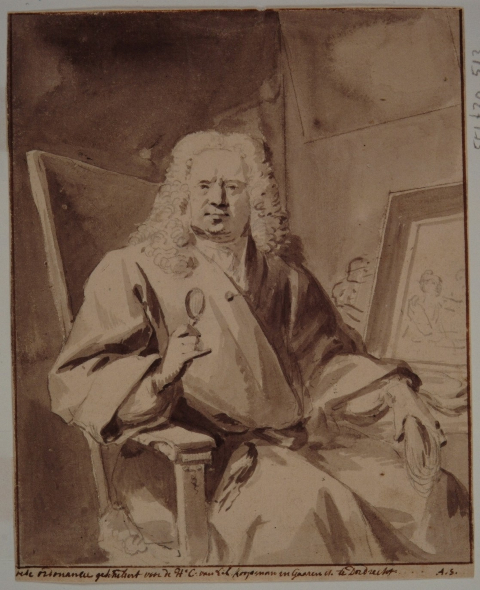- Portret van Cornelis van Lil, zittend in kamerjapon aan een tafel met daarop een schilderij; in de rechterhand een vergrootglas, in de linkerhand een streng garen