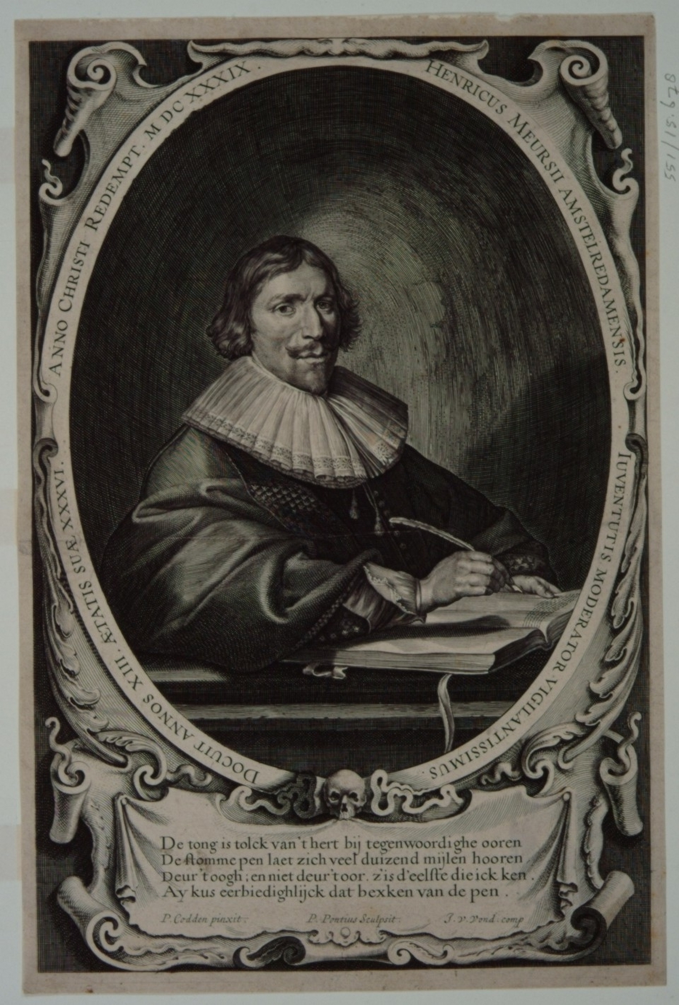- Portret van Hendrik Meurs, zittende te schrijven, in ovaal met Latijns randschrift en vierregelig vers van Joost van den Vondel.