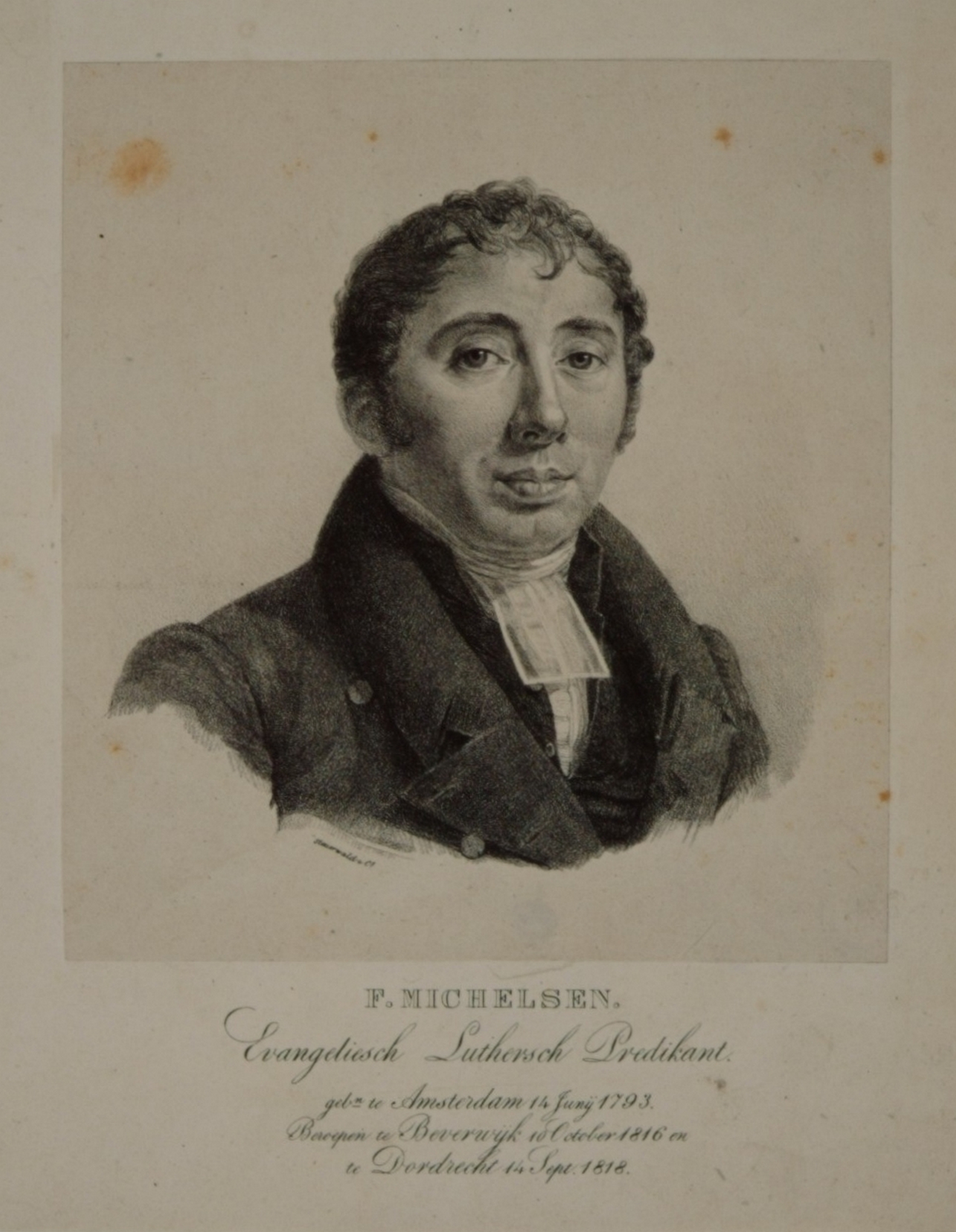 - hxb: 28,5 x 21,5 cm. Geboren in Amsterdam 1793 en overleden te Dordrecht 1886. Luthers predikant te Dordrecht 1818-1862.