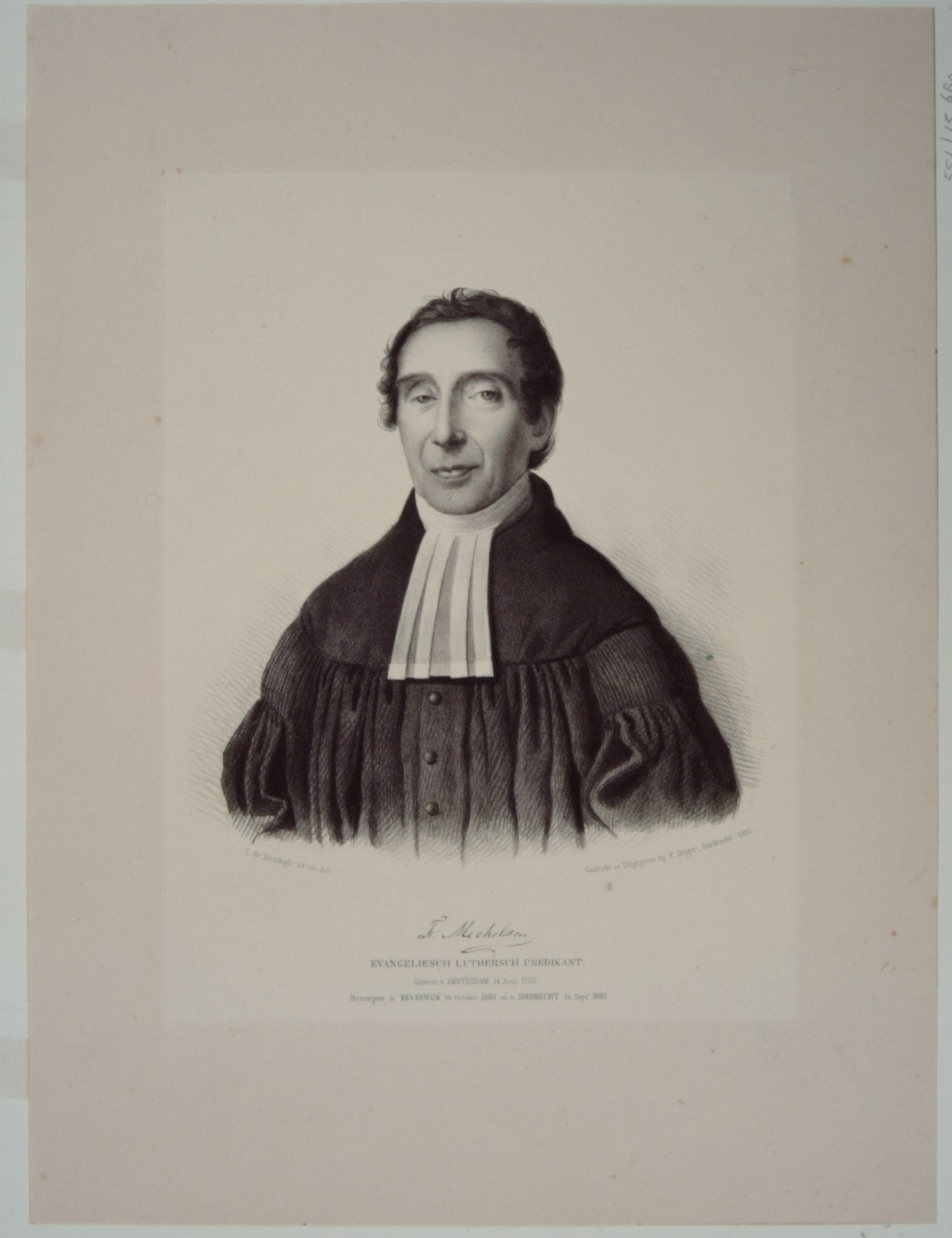 - Afmetingen: Hg. 28.5, br. 21 c. Nota Bene: Betreft Frederik Michelsen (Amsterdam 1793-Dordrecht 1886), Luthers predikant te Dordrecht 1808-1862.