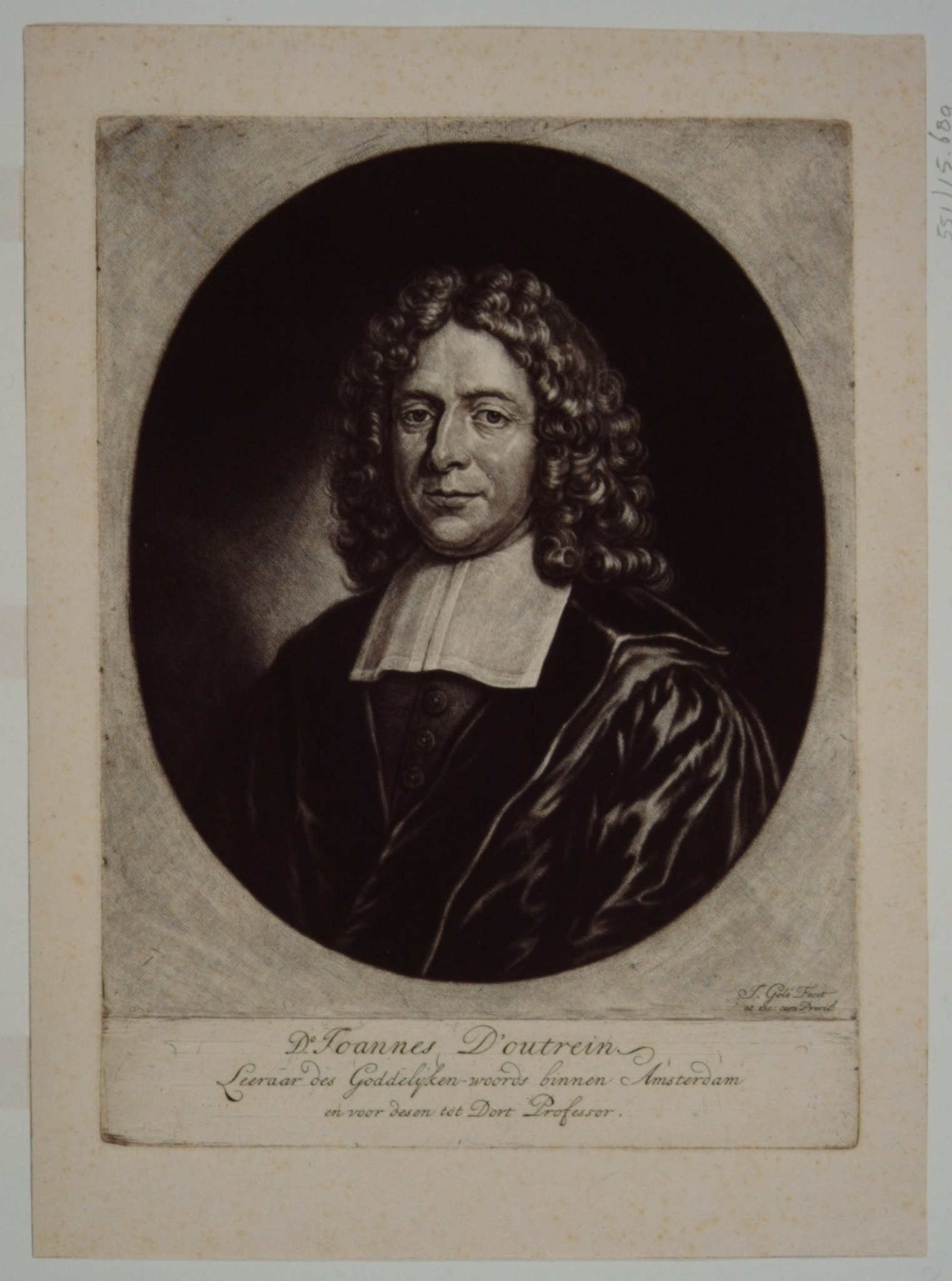 - Afmetingen: Hg. 28.8, br. 21 c. (Van Someren 1504). Nota Bene: Betreft Joannes d'Outrein, geboren te Middelburg 1662, overleden te Amsterdam 1722; Hervormd predikant te Dordrecht 1703-1708 en hoogleraar in de Wijsbegeerte aan de Illustre school aldaar, daarna te Amsterdam.