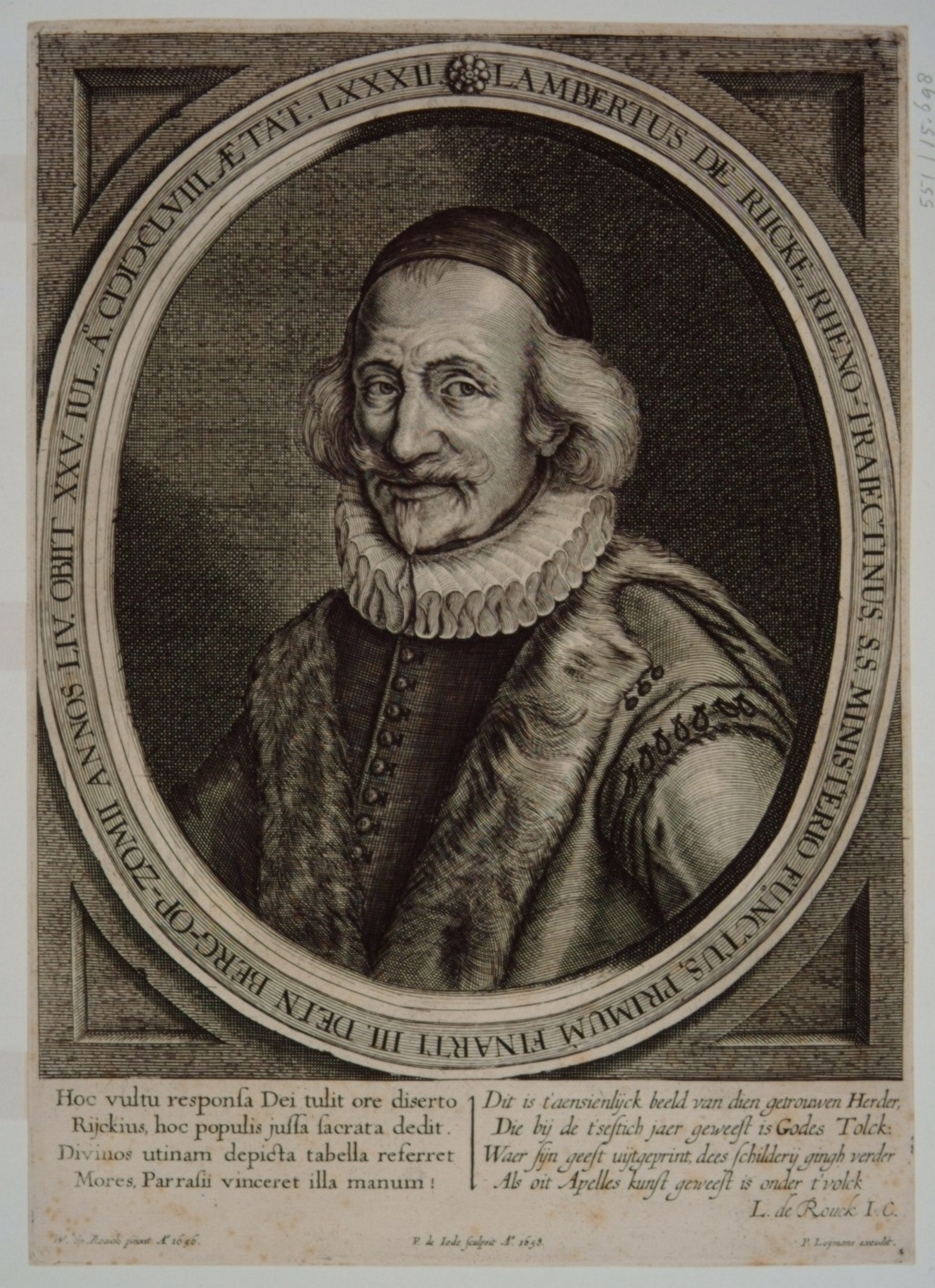 - Gravure naar schilderij door W. de Rouck uit 1656; afmetingen: Hg. 37.8, br. 26.8 c. (Muller 4652). Nota Bene: Lambertus de Rijcke, geboren te Utrecht 1576, overleden te Bergen op Zoom 1658, was Hervormd predikant te Bergen op Zoom en afgevaardigde op de Dordtse Synode 1618/19 namens Zeeland.