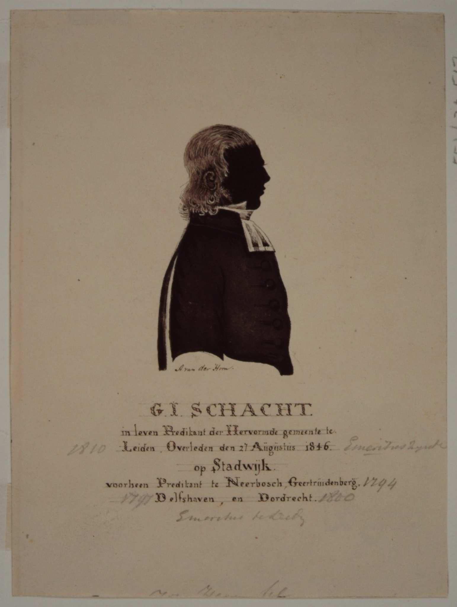 Afmetingen: Hg. 8, br. 4.3 c.; Schacht, geboren te Harderwijk in 1764 en overleden te Zoe-terwoude in 1846 was hervormd predikant te Dordrecht van 1800 tot 1810