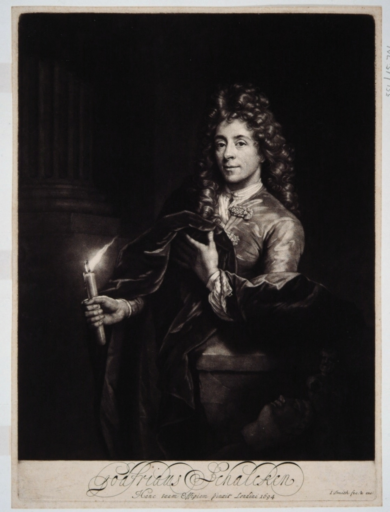 - Zwartekuntstprent naar een zelfportret uit 1694; afmetingen: Hg. 34.6, br. 25 c. (Muller 4738). Nota Bene: De kunstschilder Godfried Schalcken, geboren te Made 1643, overleden in Den Haag 1706, woonde en werkte van 1654-1692 te Dordrecht.