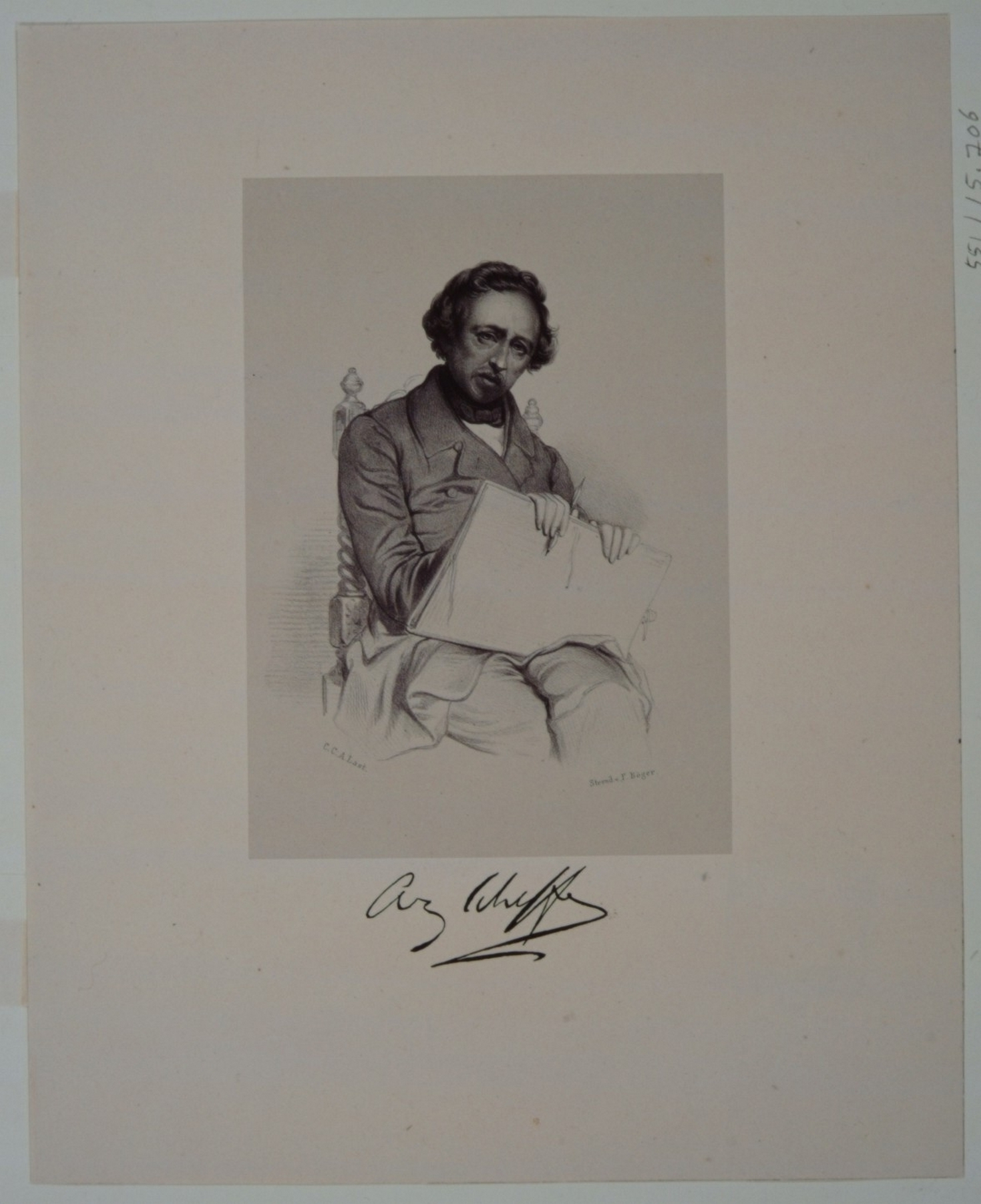- Kniestuk van de kunstschilder Ary Scheffer , zittende en met de beide handen een portefeuille vasthoudend; met afdruk van zijn handtekening.