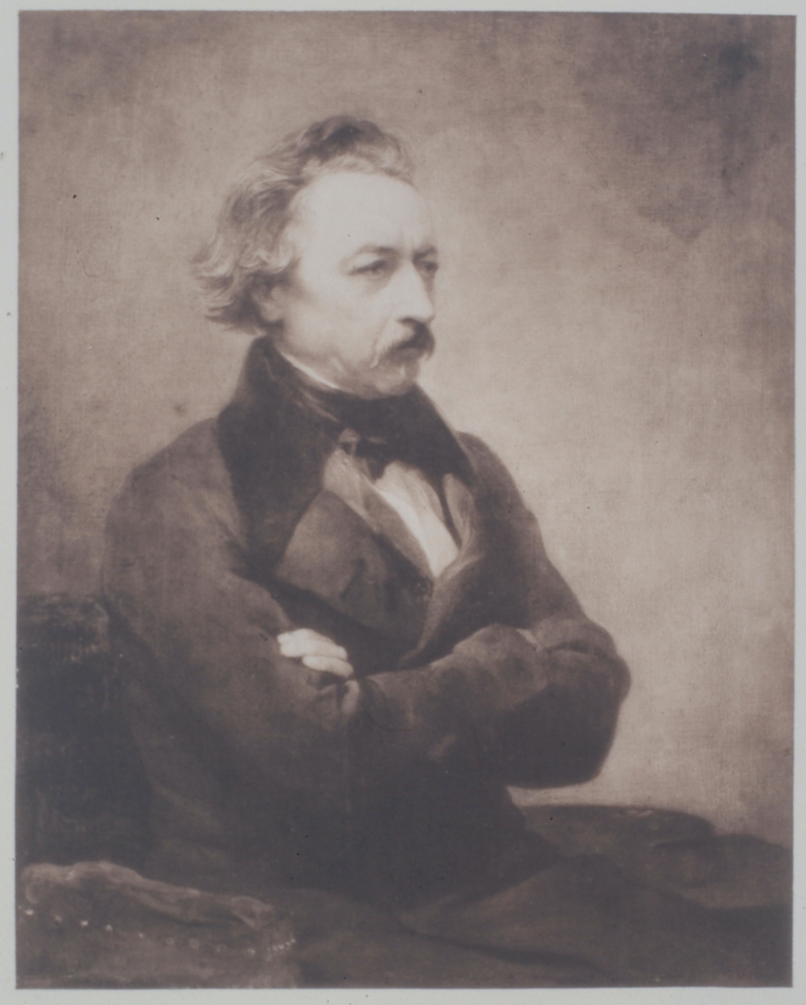 - De kunstschilder Ary Scheffer halverlijve, zittende met de armen over elkaar geslagen.