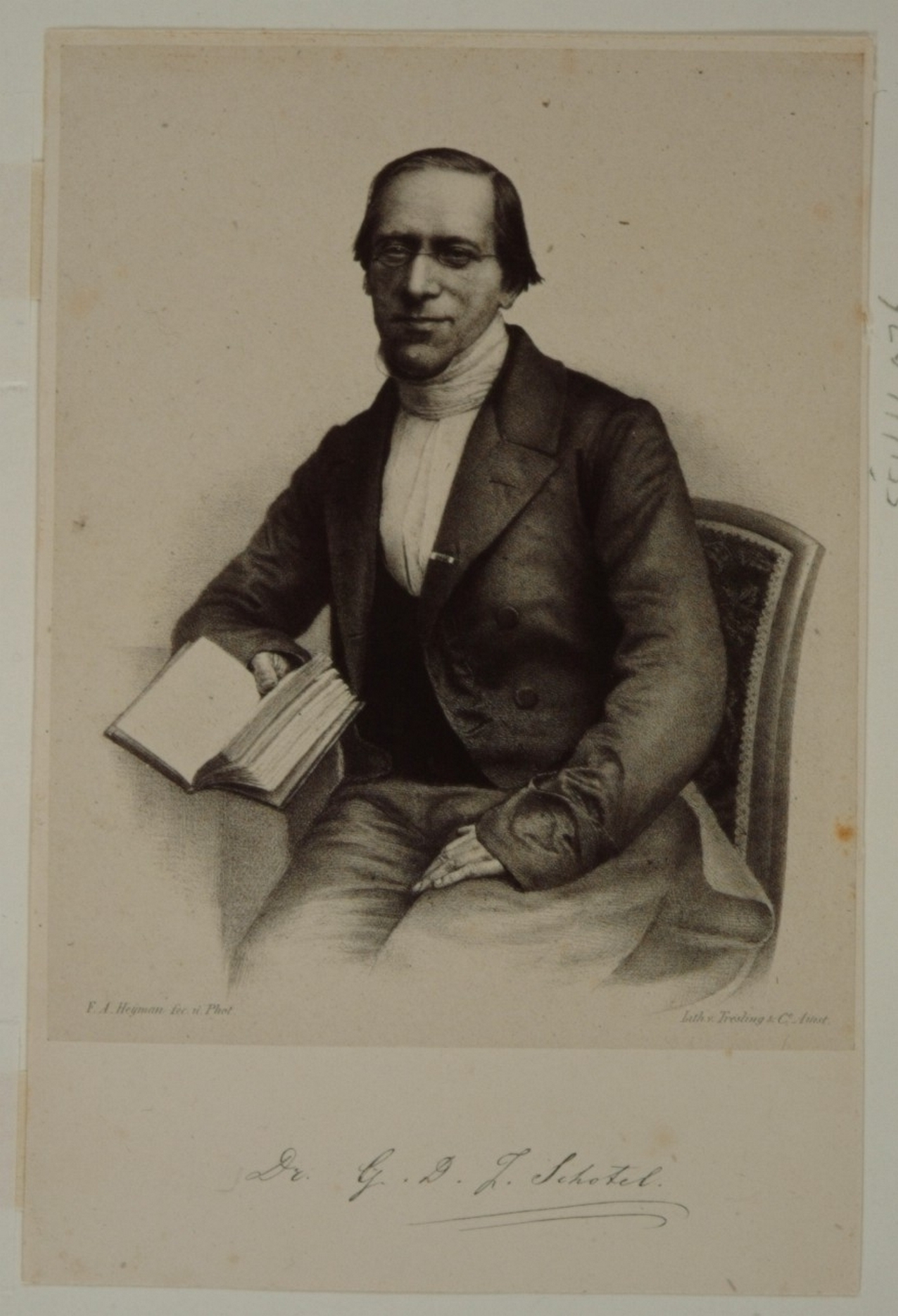 - hxb: 18,5 x 12 cm. Uit: Schotel, Een keizerl. stadhouderl. en koninkl. bezoek in de O.L. Vrouwekerk te Dordrecht. 1859. Geboren te Dordrecht 1807 en overleden in Leiden 1892. Hervormd predikant te Tilburg. Geschied- en oudheidkundige.