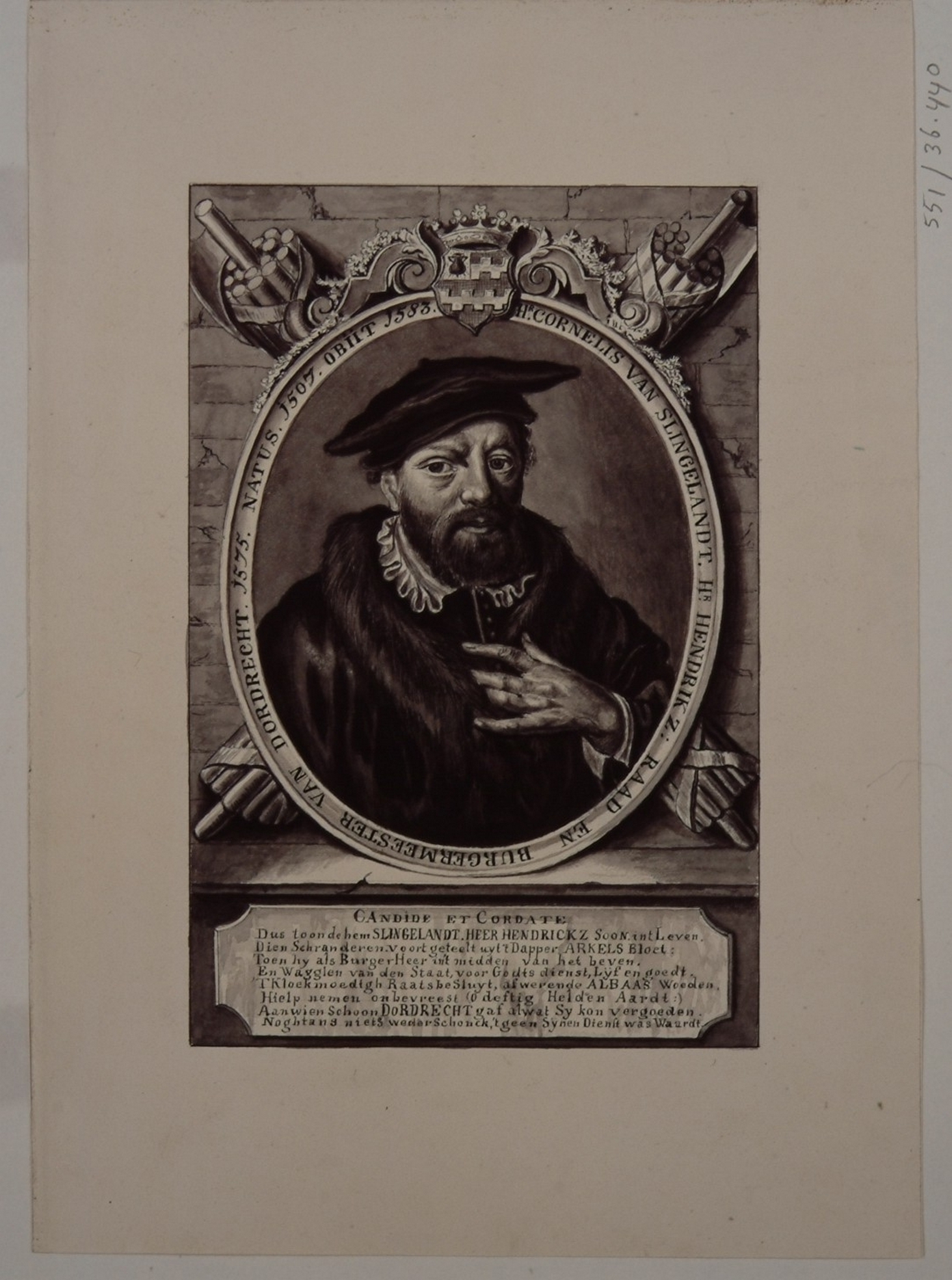 - Cornelis van Slingelandt Hendr.zn; in ovaal met randschrift en wapen en Romeinse bijlbundels, als symbolen van burgemeesterlijke waardigheid.