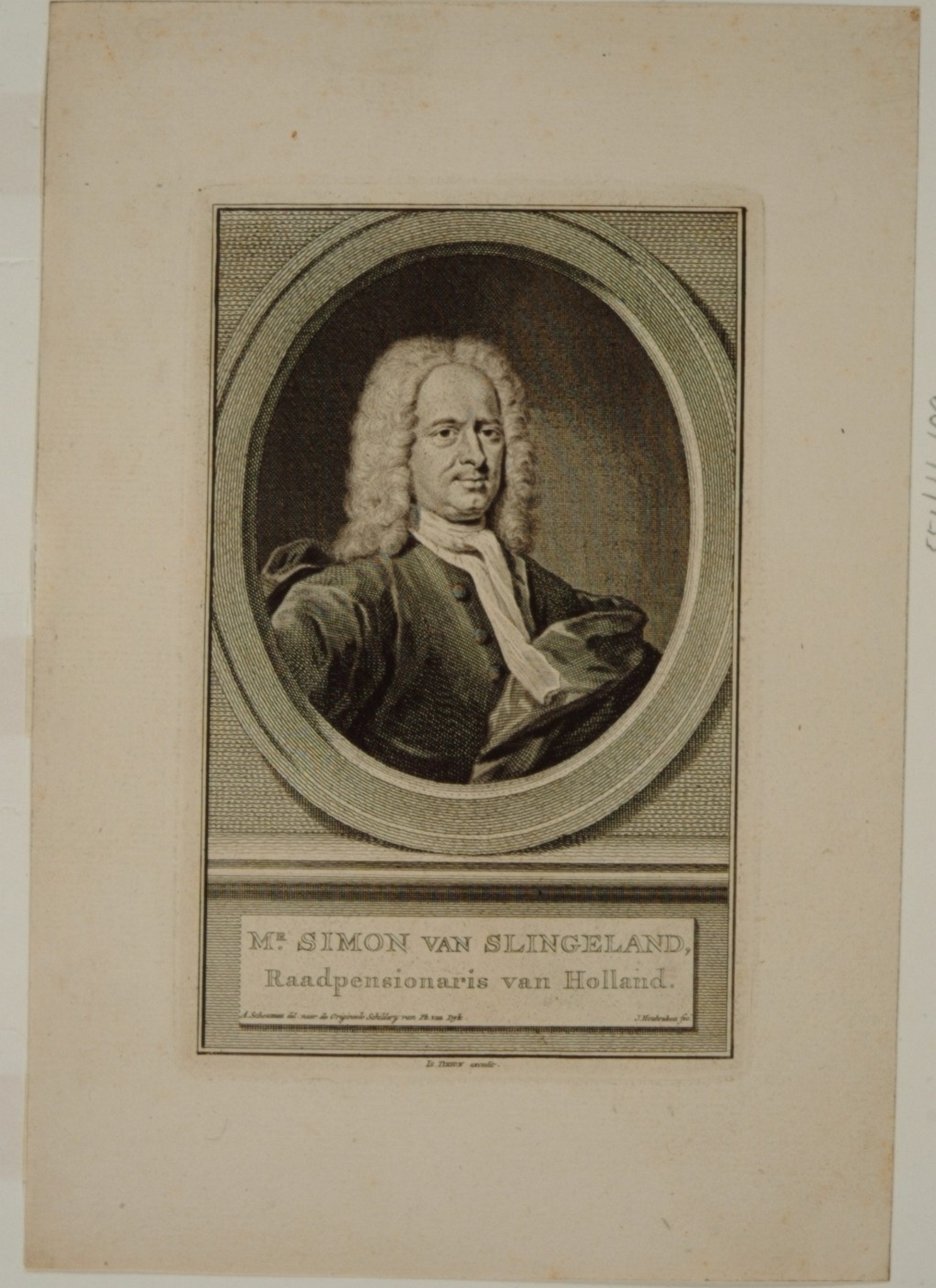 - hxb: 18 x 12 cm. Getekend door Aart Schouman naar origineel van Ph. van Dijk Uit: Wagenaar, Vaderlandse Historie, Deel XVIII; (M. 4965). Geboren te Dordrecht 1664 en overleden in Den Haag 1736. Secretaris van de Raad van State 1690, thesaurier Generaal van de Unie 1725. Raadspensionaris van Holland 1727-1736. Schrijver van staatkundige geschriften.