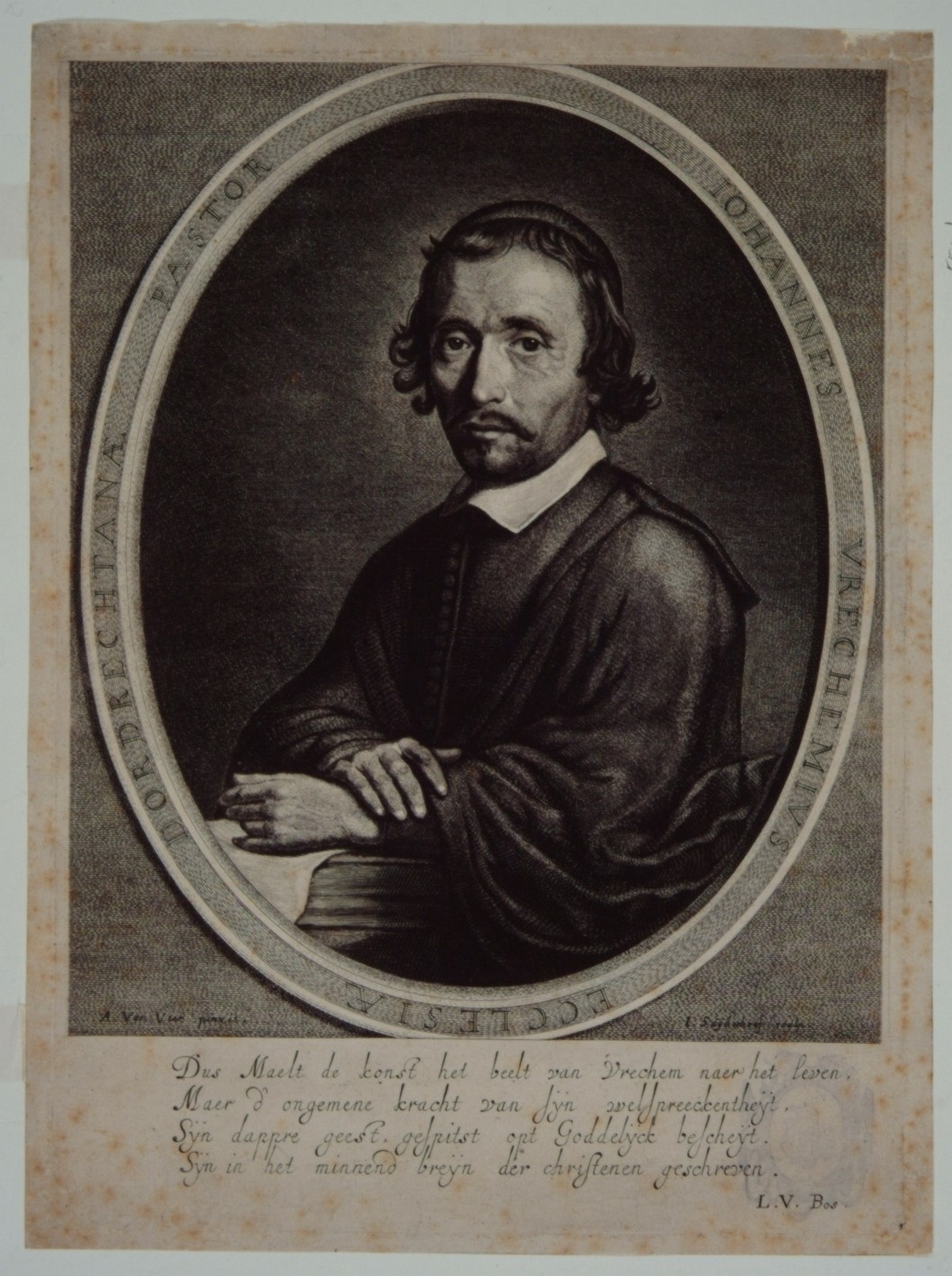 - Johannes Vrechemius ter halverlijve, in mantel met kalot op het hoofd, zittende aan een tafel; in ovaal met Latijns randschrift en vierregelig Nederlands vers van Lambert van den Bos.