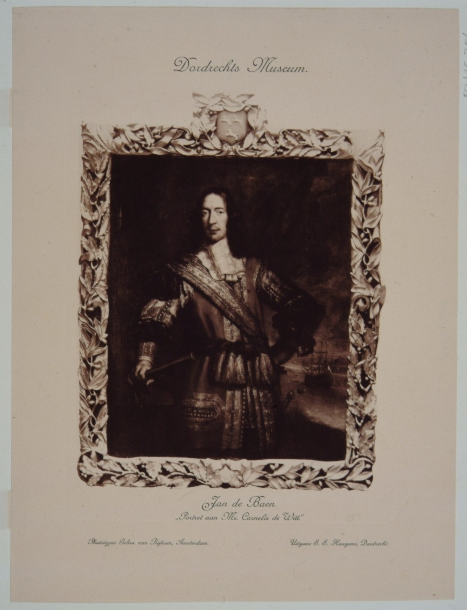 - Naar schilderij door Jan de Baen in Dordrechts Museum; uit: Album Dordrechts Museum; afmetingen: Hg. 24, br. 18 c. Nota Bene: Mr. Cornelis de Witt werd geboren te Dordrecht op 15 juni 1623 en vermoord in Den Haag op 20 augustus 1672. Hij was schepen en burgemeester van Dordrecht, gecommitteerde van die stad in de Staten van Holland en West Friesland, gevolmachtigde van de Staten-Generaal op 's Lands vloot bij de tocht naar Chatham in 1667 en de slag bij Solebay in 1672 en Ruwaard van Putten.