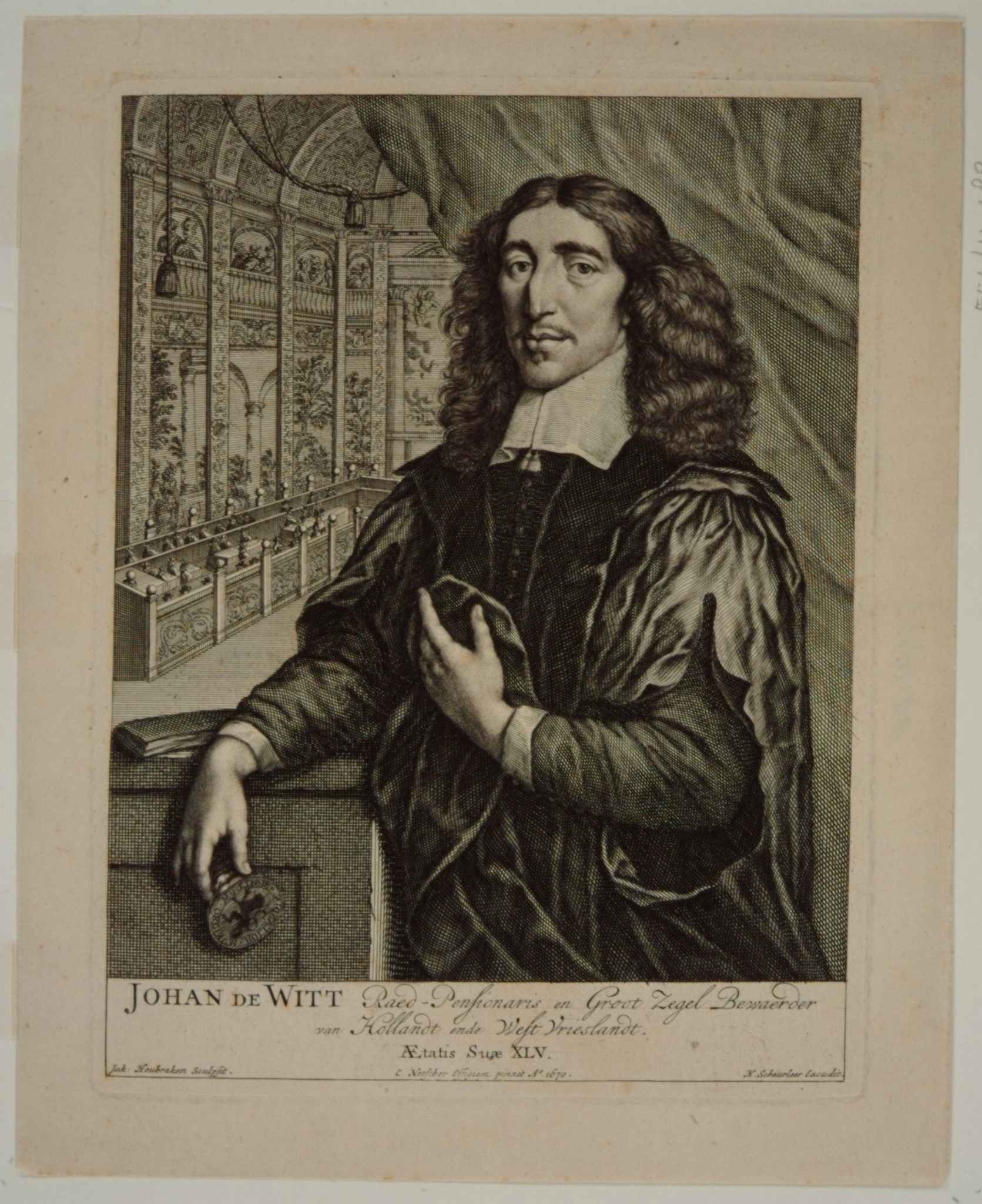 - Portret van Johan de Witt met zegel in de hand. Op de achtergrond is de vergaderzaal van de Staten van Holland te zien.