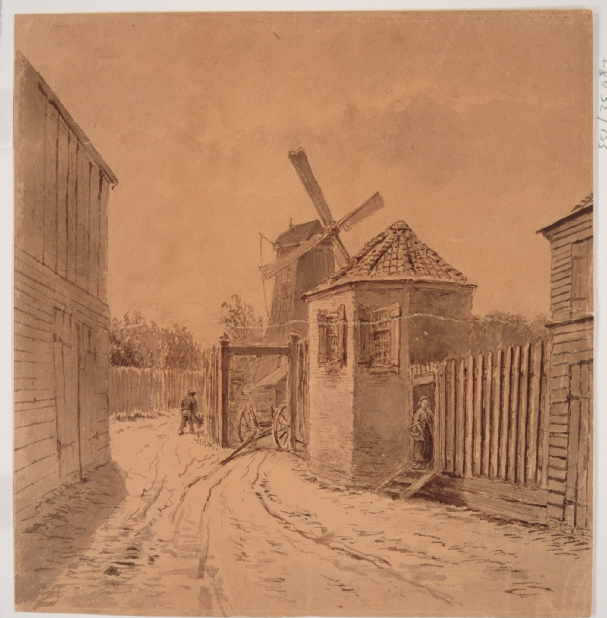 - hxb: 27,5 x 26,5 cm. Aan de achterzijde staat: Dordrecht - Lage Bakstraat. Koepel en houtzaagmolen van Jan Schouten, scheepmaker, zooals ik het in mijn jeugd gekend heb. Frans Lebret 1907 (aet. 86).