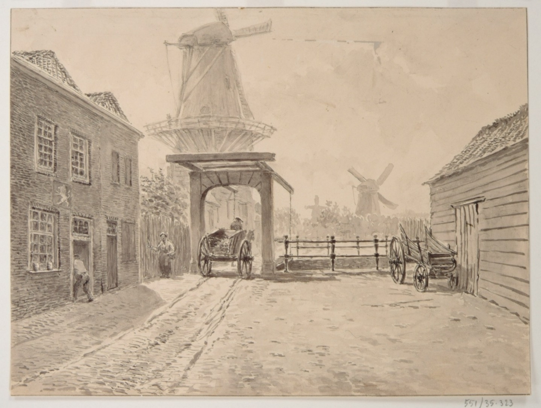 Wilgenbos - Witteleeuwsbrug, gezien vanuit de stad. Links vooraan een huis met gevelsteen, waarop een leeuw; over de brug oliemolen de Poortklok, later de Karper geheten, omstreeks 1830.