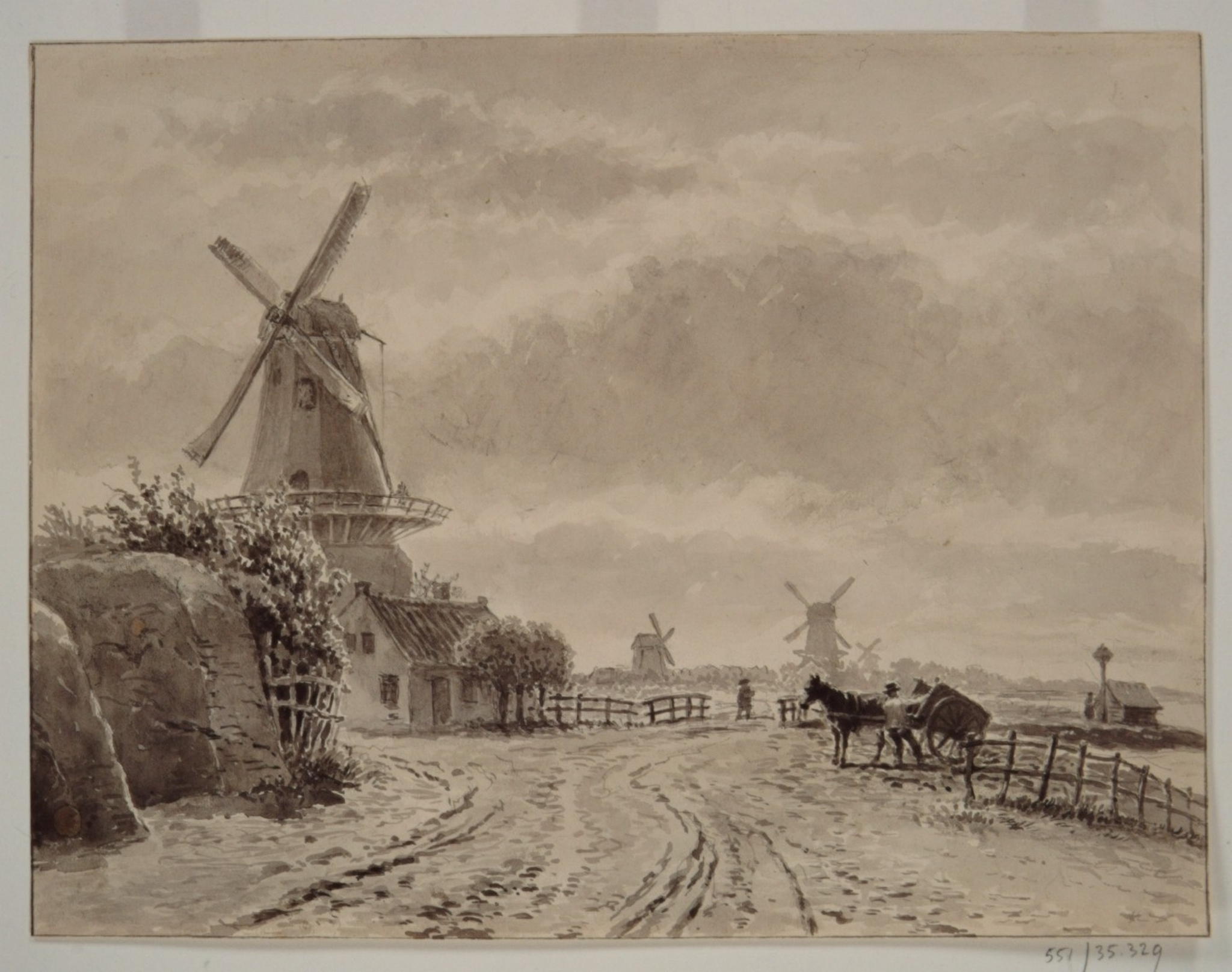 - 's Gravendeelsedijk met korenmolen de Pelikaan op de hoek Weeskinderendijk en brug over het Papegat. Links een oven van een steenbakkerij. Rechts de vuilstort en het wachthuisje met seinmand voor het veer op Steenenkamer, omstreeks 1860.