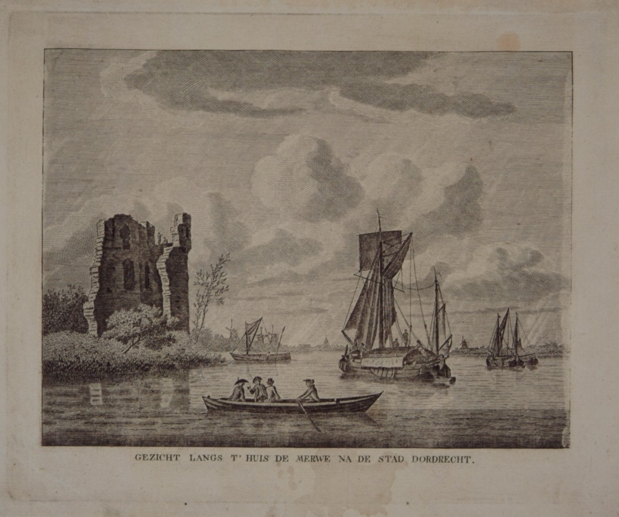 Gezicht op het Huis te Merwede, de rivier de Merwede met daarop een hooischip en een roeiboot met vier personen en in het verschiet de stad Dordrecht.