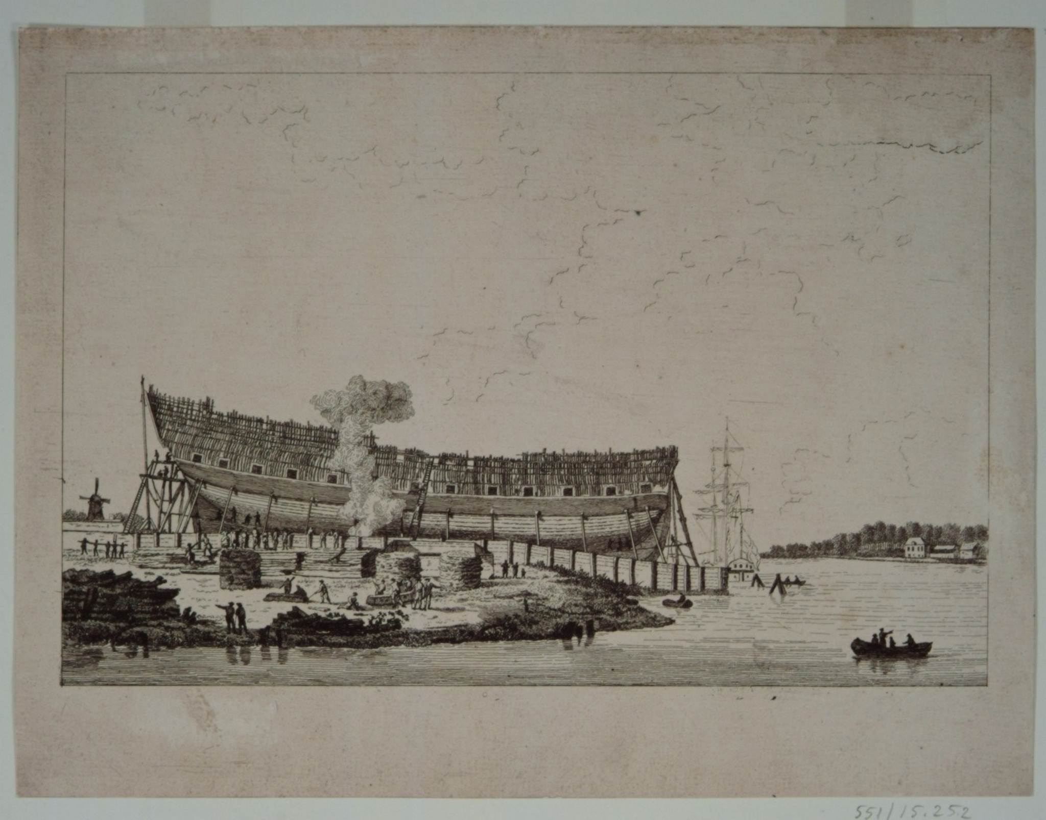 Het op stapel staande oorlogsschip de Hercules, gebouwd door de scheepstimmerman J. Spaan, op de n ieuwe werf aan het Wilgenbos in 1782.