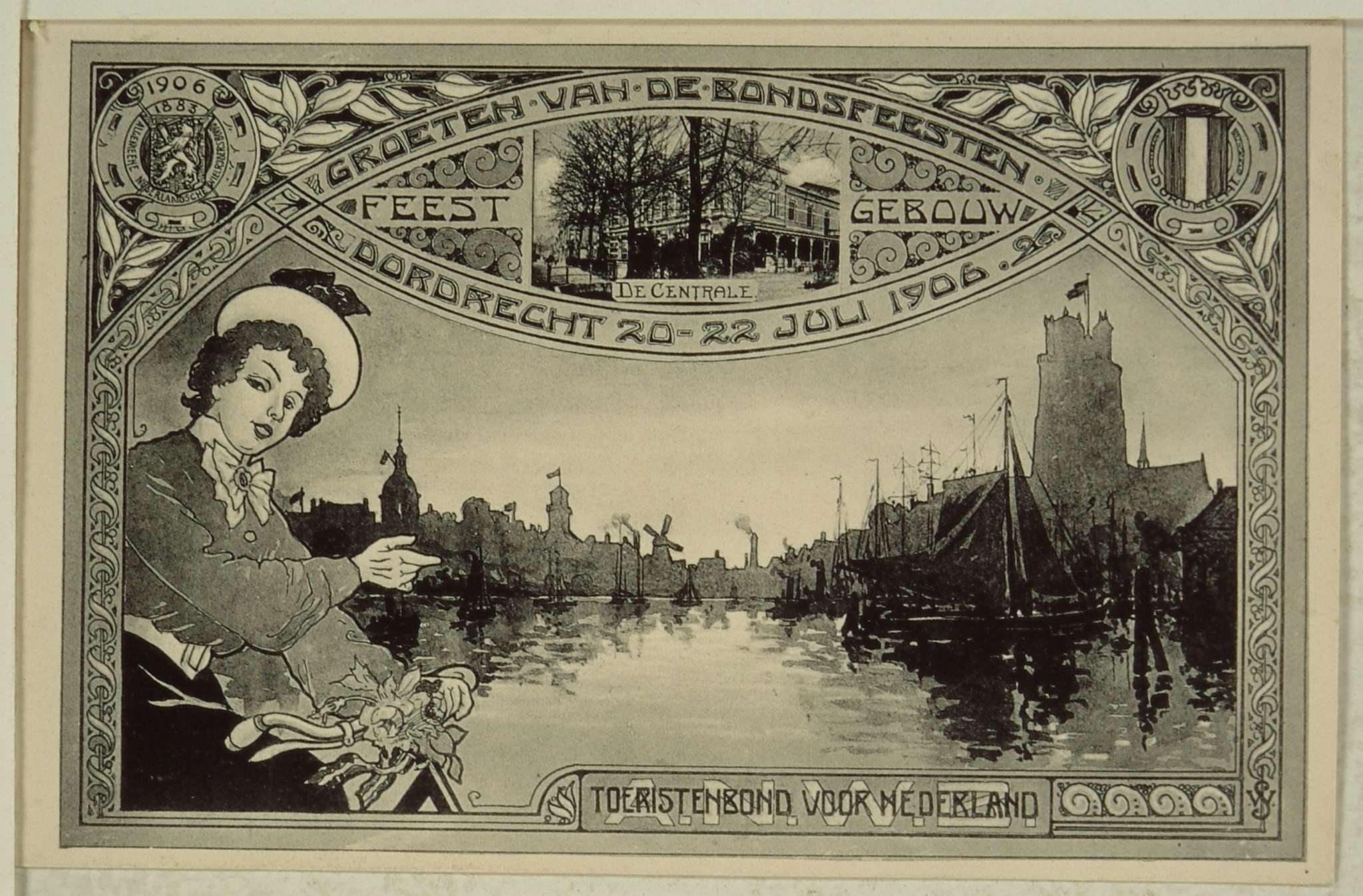 - Herinneringskaart congres ANWB 20-22 juli 1906 1906, 20-22 Juli. Bijeenkomst van den Algem. Nederl. Wielrijdersbond te Dordrecht. Groeten van de Bondsfeesten. Dordrecht 20-22 Juli 1906. Prent-briefk. met gezicht op Dordt. Uitg. v. V. D. W. (v. d. Weg).